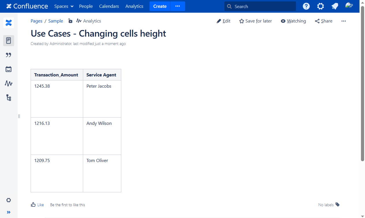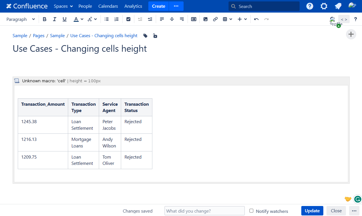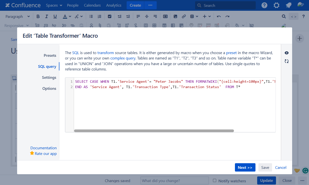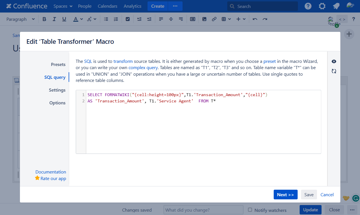 - to adjust the height of a column:SELECT FORMATWIKI("{cell:height=100px}",T1.'Transaction_Amount',"{cell}") AS 'Transaction_Amount', T1.'Service Agent' FROM T*The height applied to at least one column applies to the entire table.