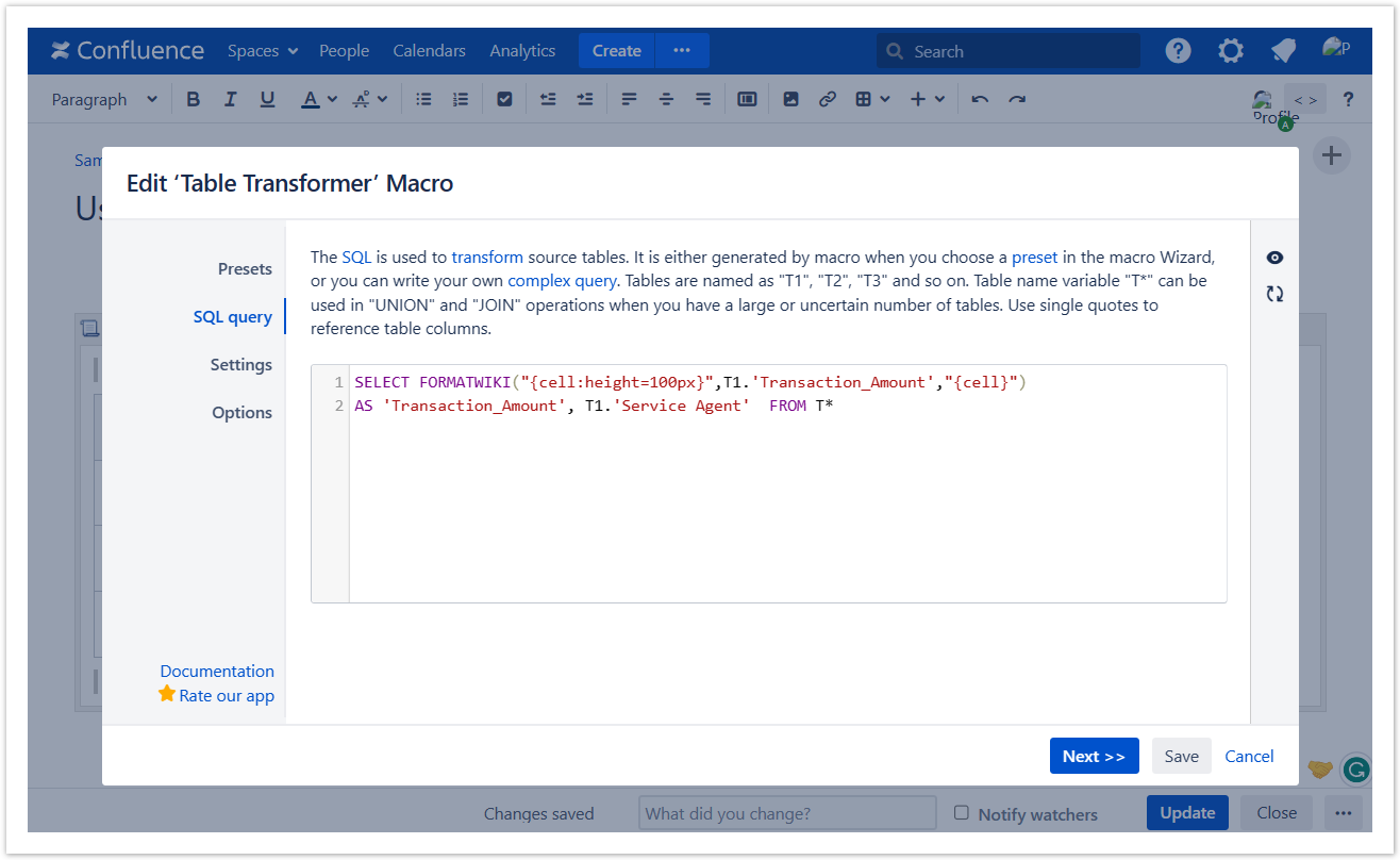 2. Insert the Table Transformer macro and paste the table or the macros outputting tables within the macro body.