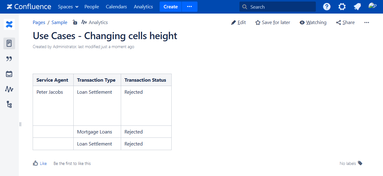 SELECT CASE WHEN T1.'Service Agent'= "Peter Jacobs" THEN FORMATWIKI("{cell:height=100px}",T1.'Service Agent',"{cell}") END AS 'Service Agent', T1.'Transaction Type',T1.'Transaction Status' FROM T*Pick at least one value in a row to adjust the cells height and add a conditional function such as IF, CASE WHEN, etc. paired with the FORMATWIKI function.