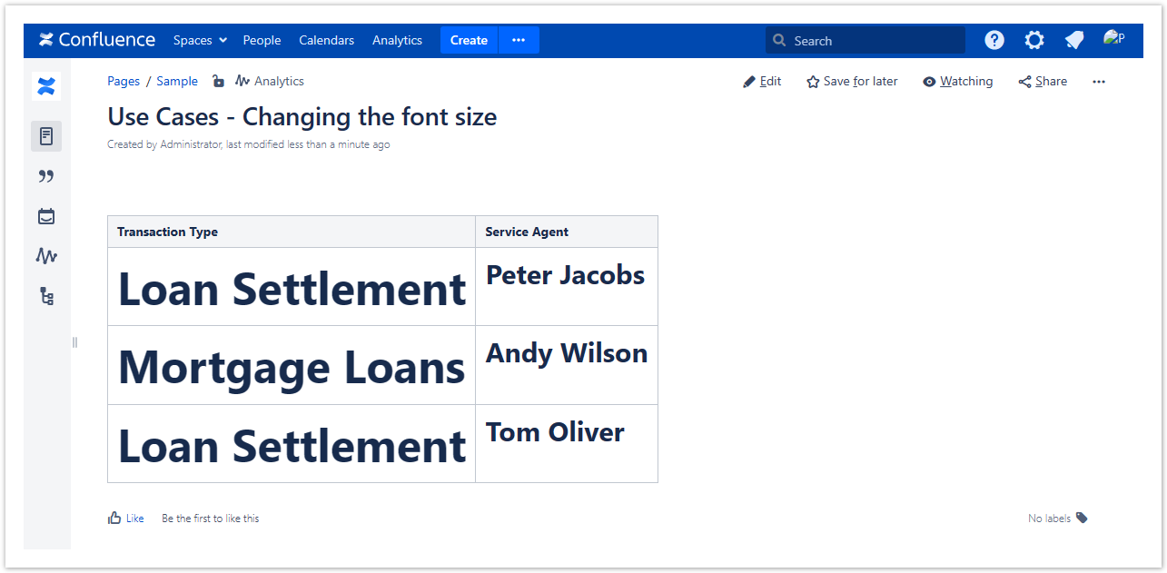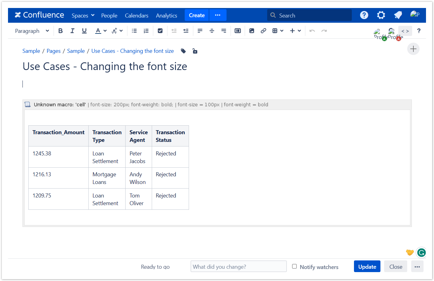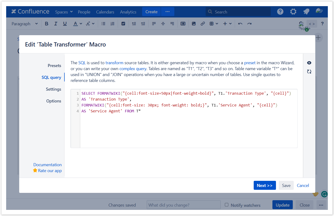 SELECT FORMATWIKI("{cell:font-size=50px|font-weight=bold}", T1.'Transaction Type', "{cell}") AS 'Transaction Type', FORMATWIKI("{cell:font-size: 30px; font-weight: bold;}", T1.'Service Agent', "{cell}") AS 'Service Agent' FROM T*Click Next.