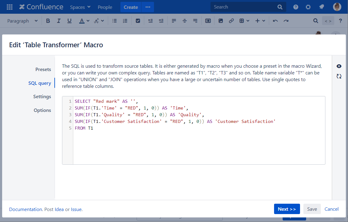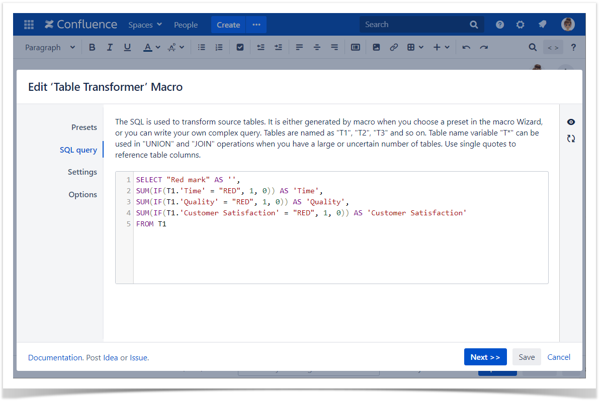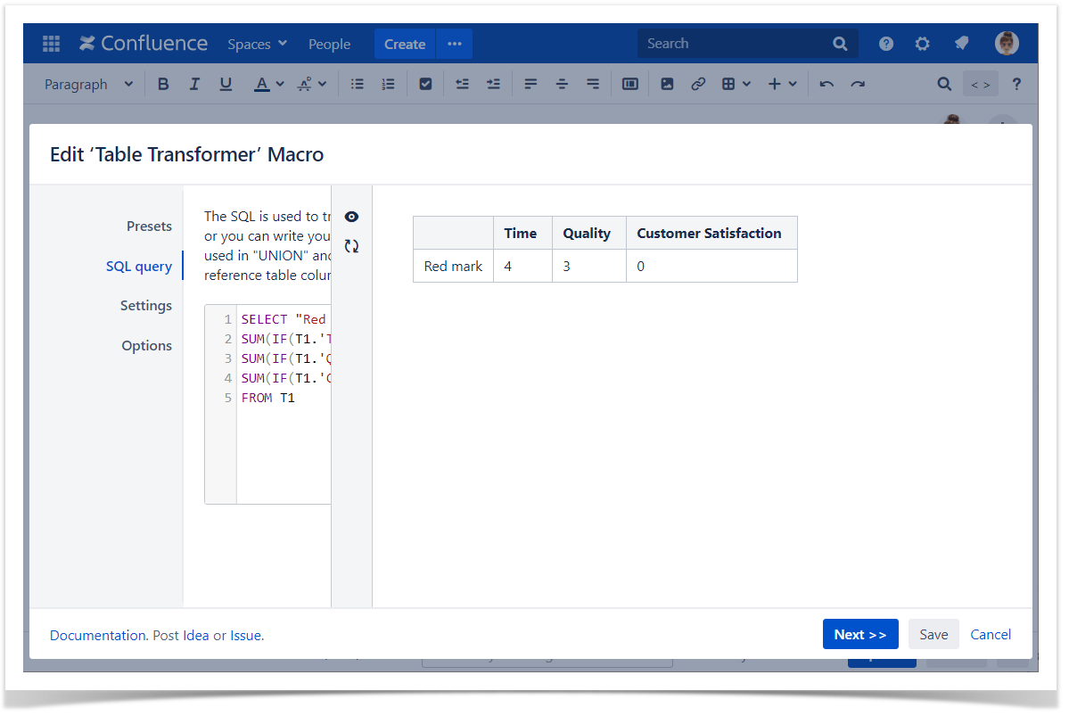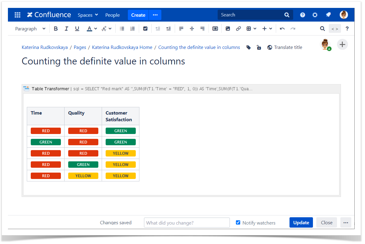 SELECT "Red mark" AS '', SUM(IF(T1.'Time' = "RED", 1, 0)) AS 'Time', SUM(IF(T1.'Quality' = "RED", 1, 0)) AS 'Quality', SUM(IF(T1.'Customer Satisfaction' = "RED", 1, 0)) AS 'Customer Satisfaction' FROM T1