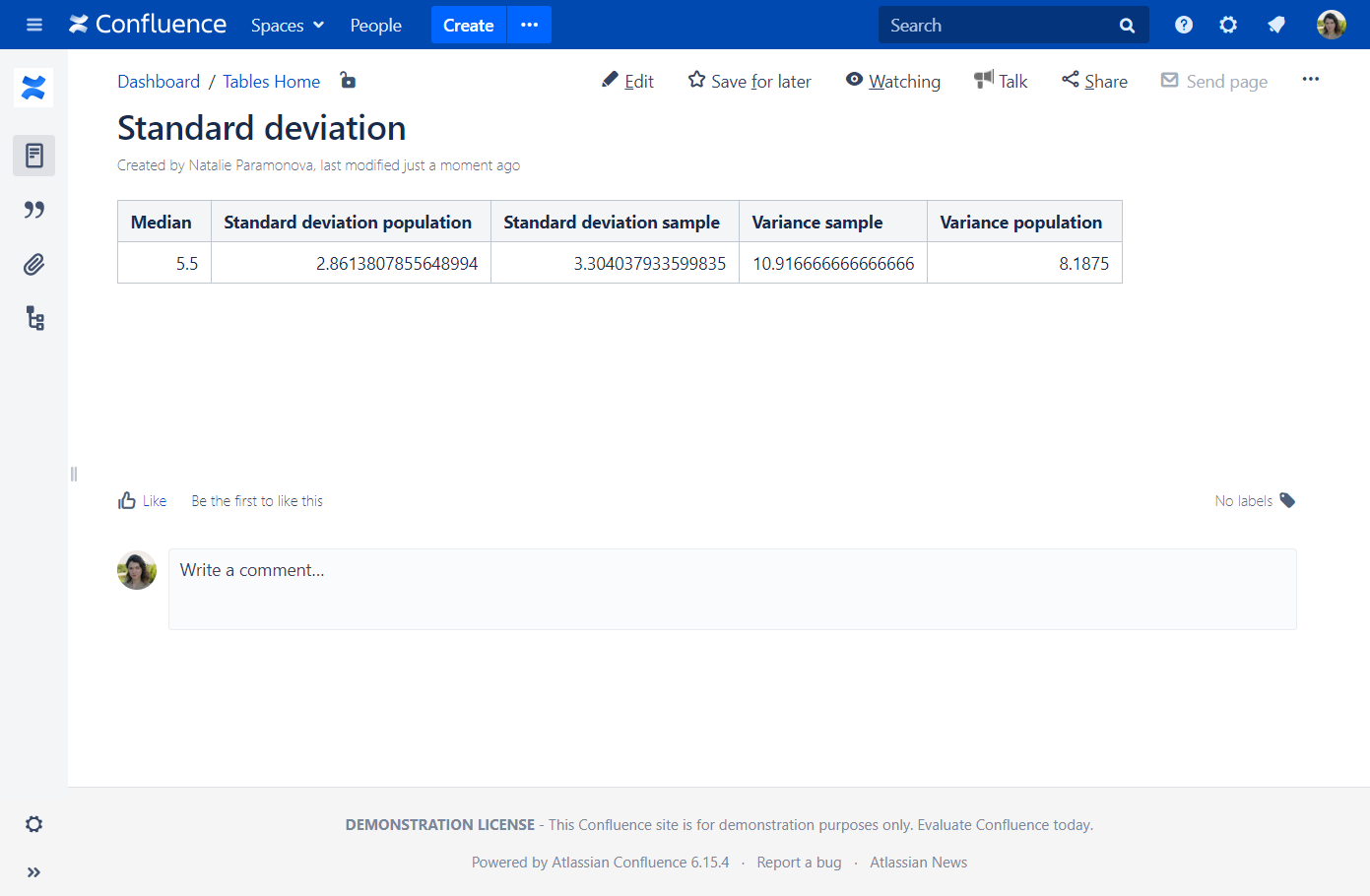 SELECT MEDIAN(T1.'Value') AS 'Median', STDDEV(T1.'Value') AS 'Standard deviation population', STDEV(T1.'Value') AS 'Standard deviation sample', VAR(T1.'Value') AS 'Variance sample', VARP(T1.'Value') AS 'Variance population' FROM T1