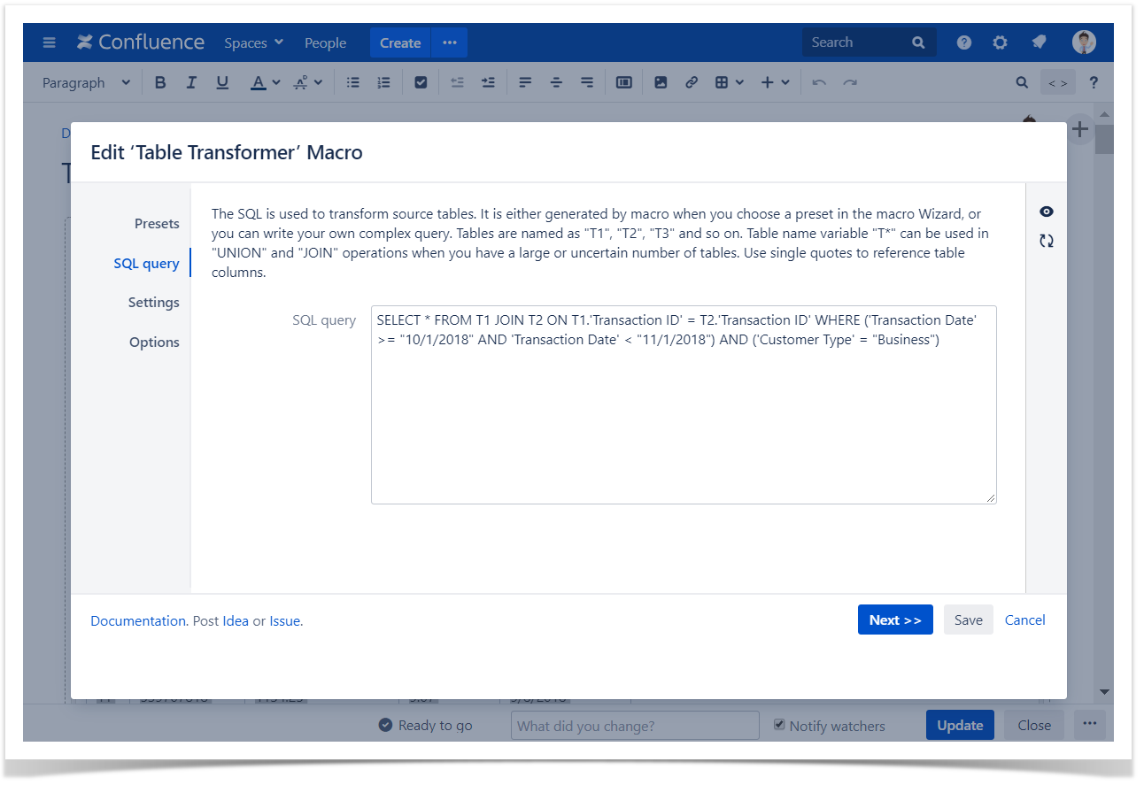 SELECT * FROM T1 JOIN T2 ON T1.'Transaction ID' = T2.'Transaction ID' WHERE ( 'Transaction Date' >= "10 / 1 / 2018" AND 'Transaction Date' < "11 / 1 / 2018" ) AND ( 'Customer Type' = "Business" )WHERE ('...' >= "10/1/2018" AND '...' < "11/1/2018") AND ('...' = "...") extracts only those records that fulfill a specified condition.