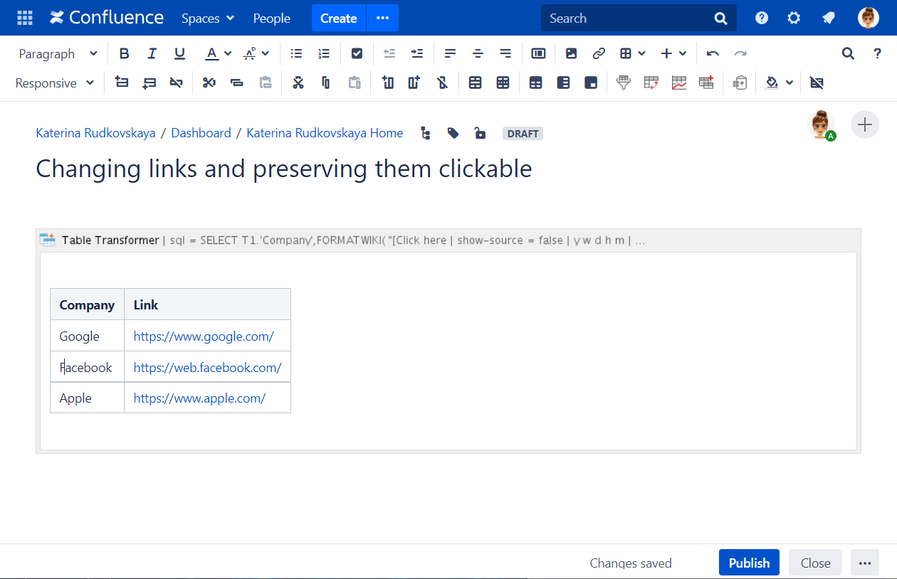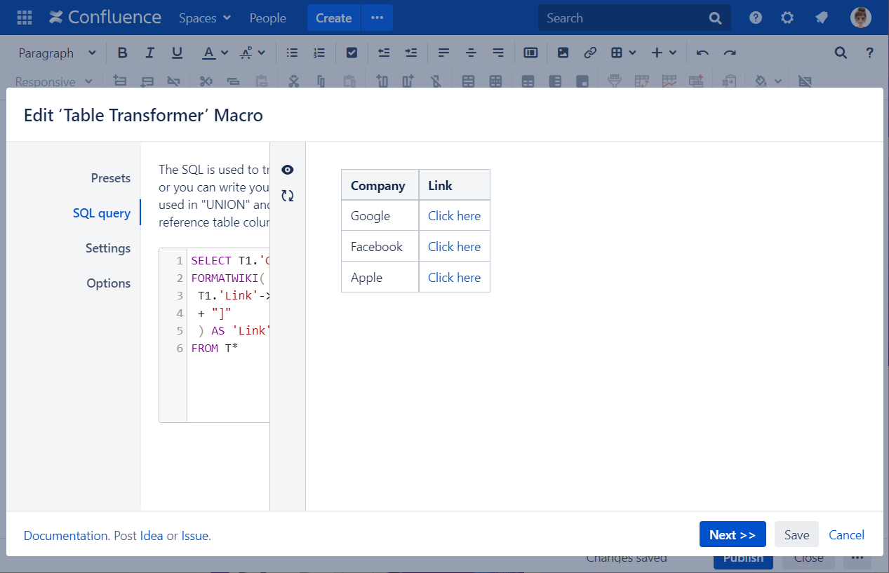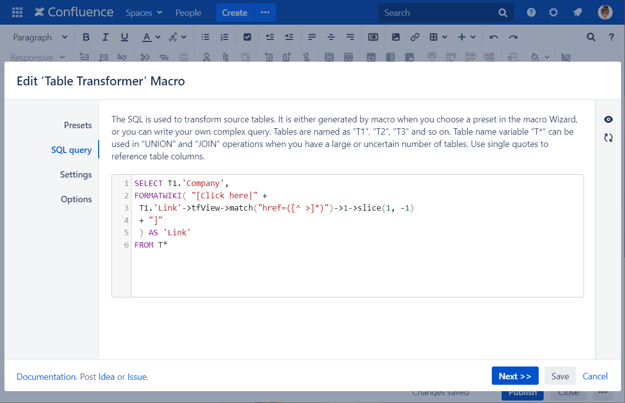 SELECT T1.'Company', FORMATWIKI( "[Click here|" + T1.'Link'->tfView->match("href=([^ >]*)")->1->slice(1, -1) + "]" ) AS 'Link' FROM T*Save the macro and the page.