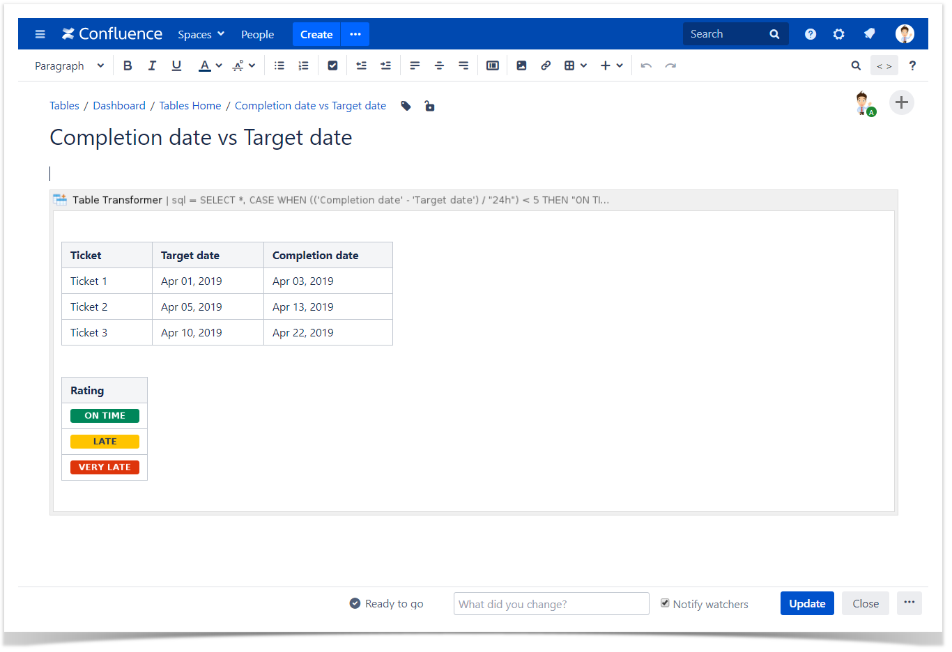 SELECT *, CASE WHEN (('Completion date' - 'Target date') / "24h") < 5 THEN "ON TIME" WHEN (('Completion date' - 'Target date') / "24h") > 5 AND (('Completion date' - 'Target date') / "24h") <= 10 THEN "LATE" ELSE "VERY LATE" END AS 'Rating' FROM T1- Click Next.