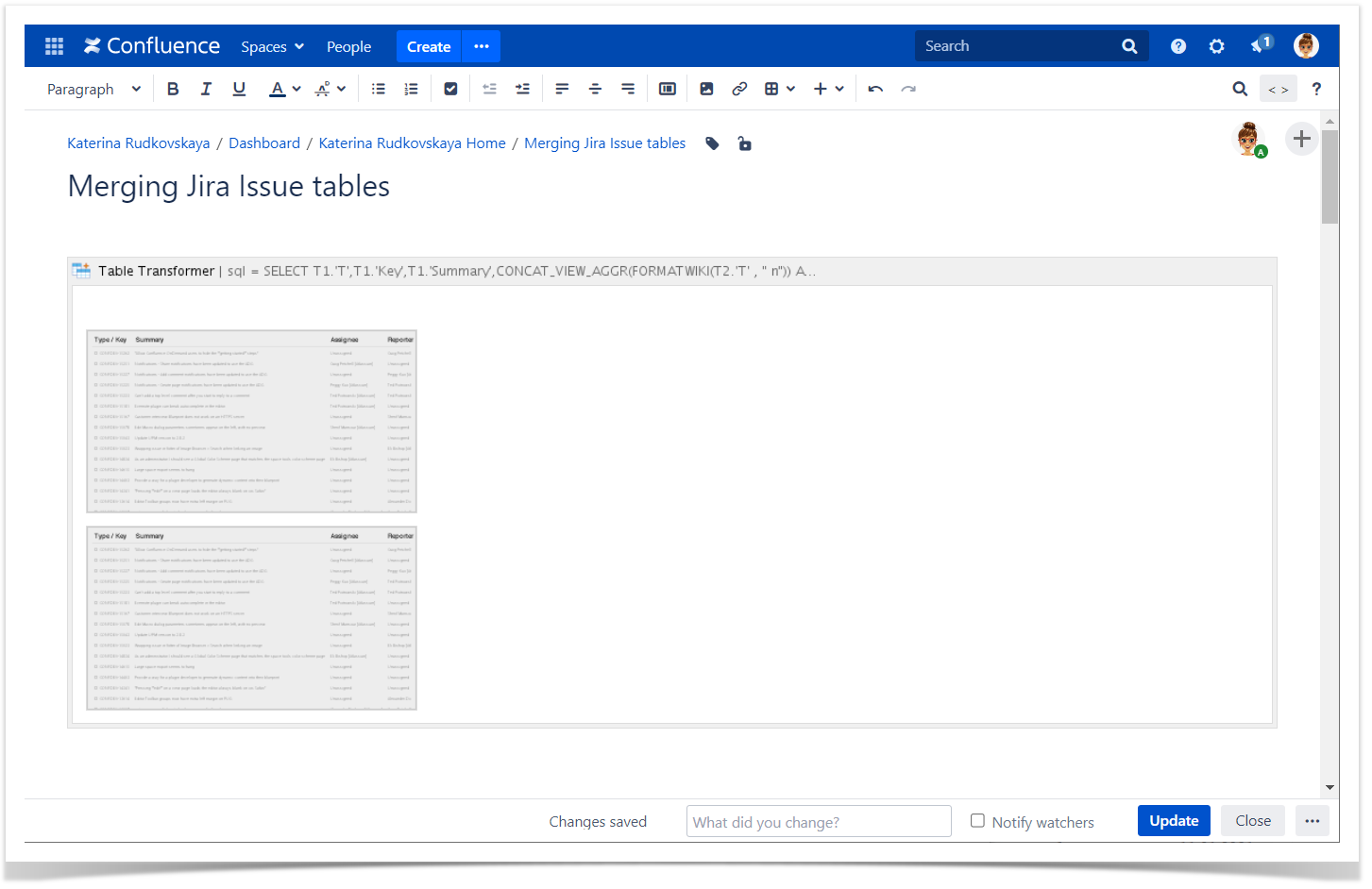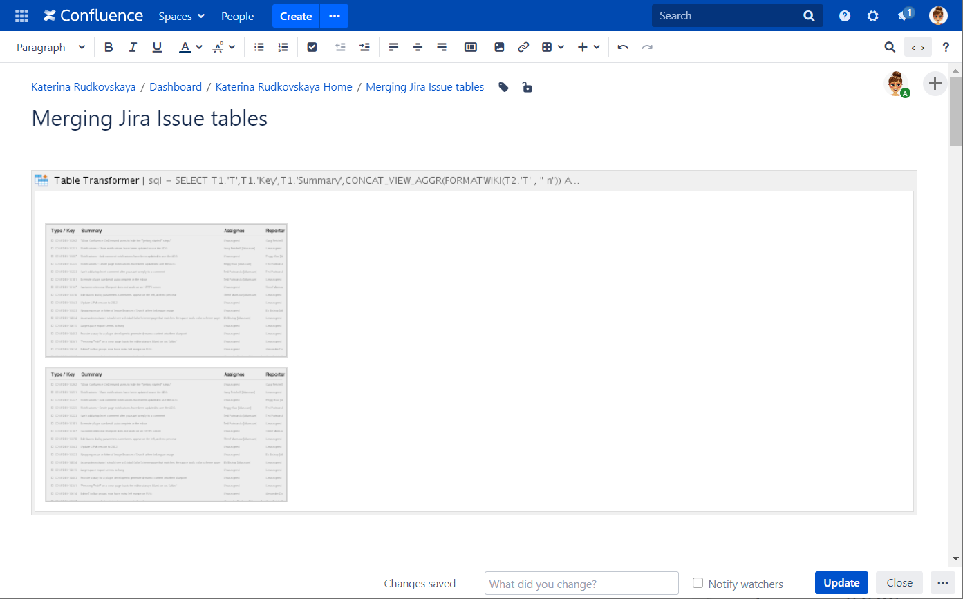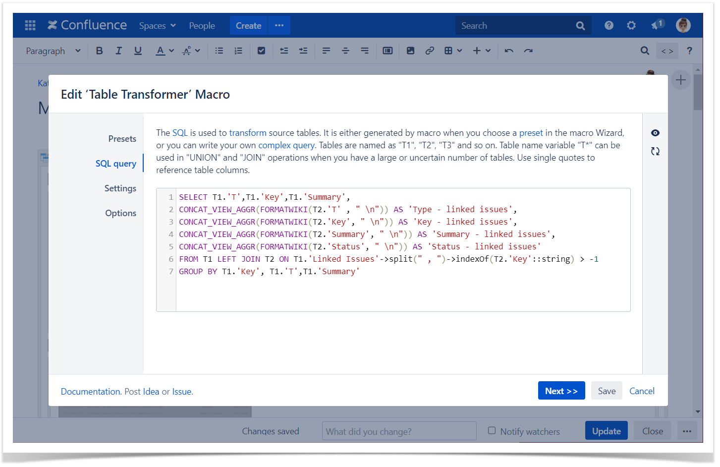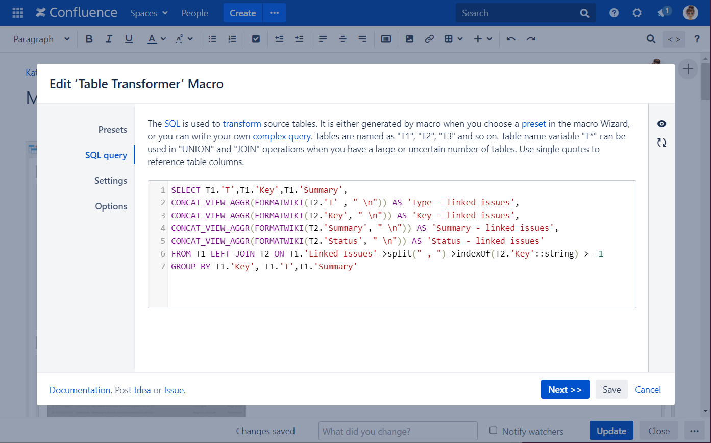 SELECT T1.'T',T1.'Key',T1.'Summary', CONCAT_VIEW_AGGR(FORMATWIKI(T2.'T' , " \n")) AS 'Type - linked issues', CONCAT_VIEW_AGGR(FORMATWIKI(T2.'Key', " \n")) AS 'Key - linked issues', CONCAT_VIEW_AGGR(FORMATWIKI(T2.'Summary', " \n")) AS 'Summary - linked issues', CONCAT_VIEW_AGGR(FORMATWIKI(T2.'Status', " \n")) AS 'Status - linked issues' FROM T1 LEFT JOIN T2 ON T1.'Linked Issues'->split(" , ")->indexOf(T2.'Key'::string) > -1 GROUP BY T1.'Key', T1.'T',T1.'Summary'The joining may be also done using the following functions: