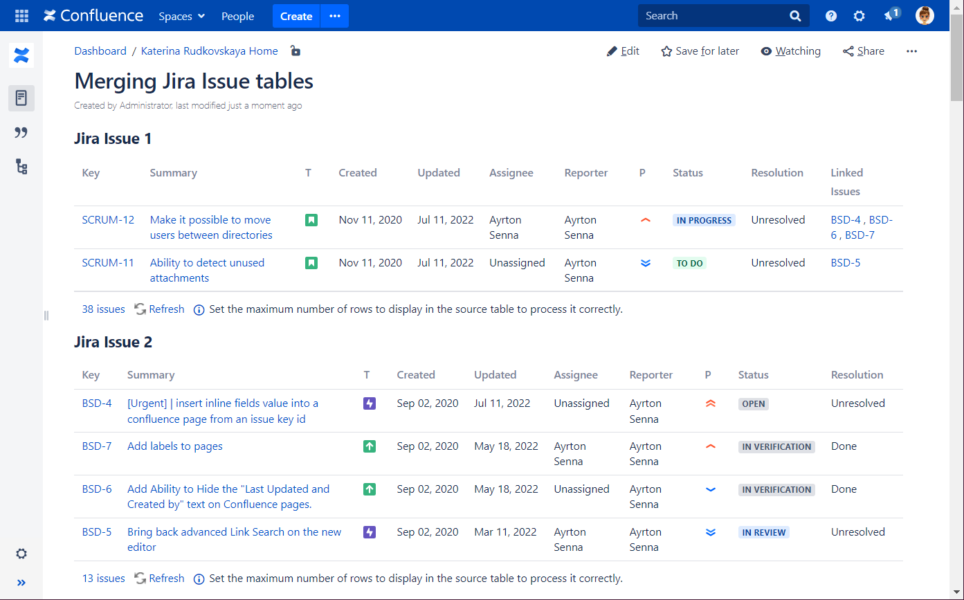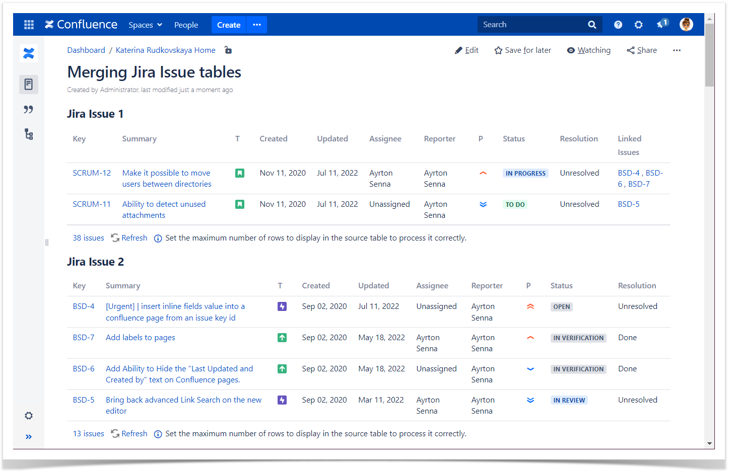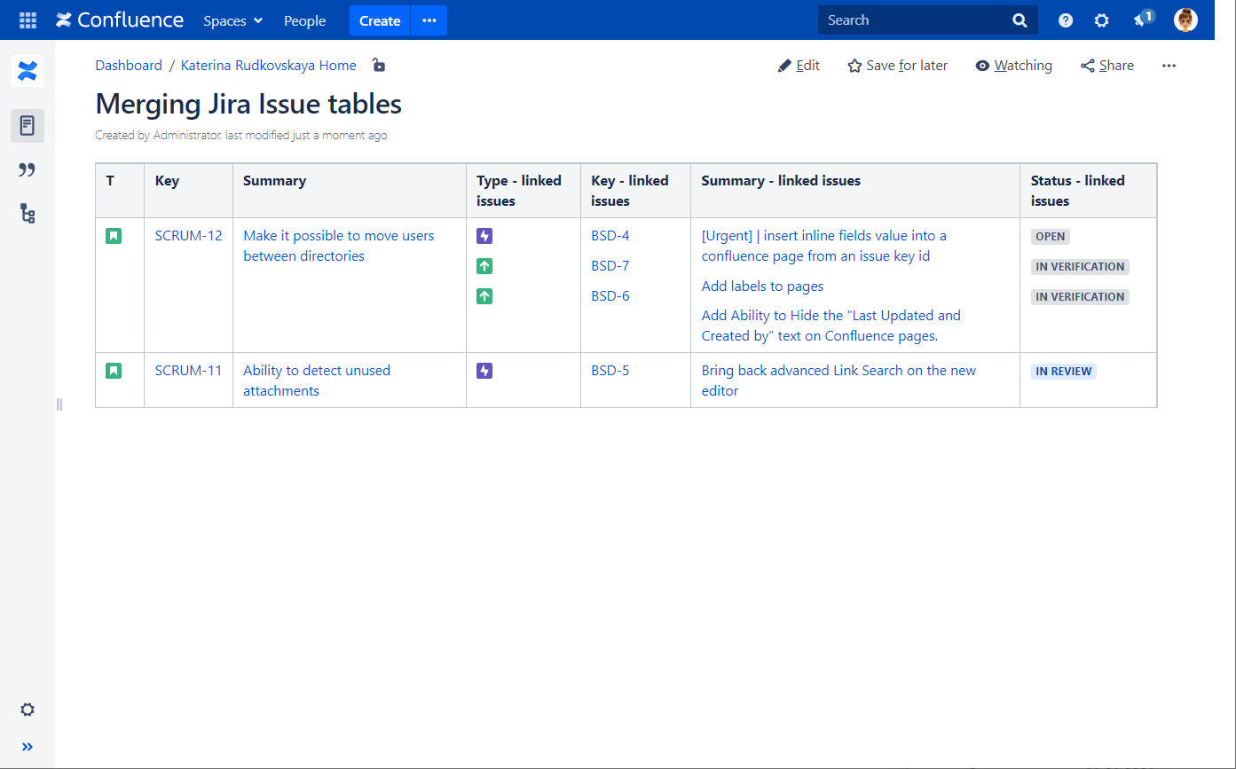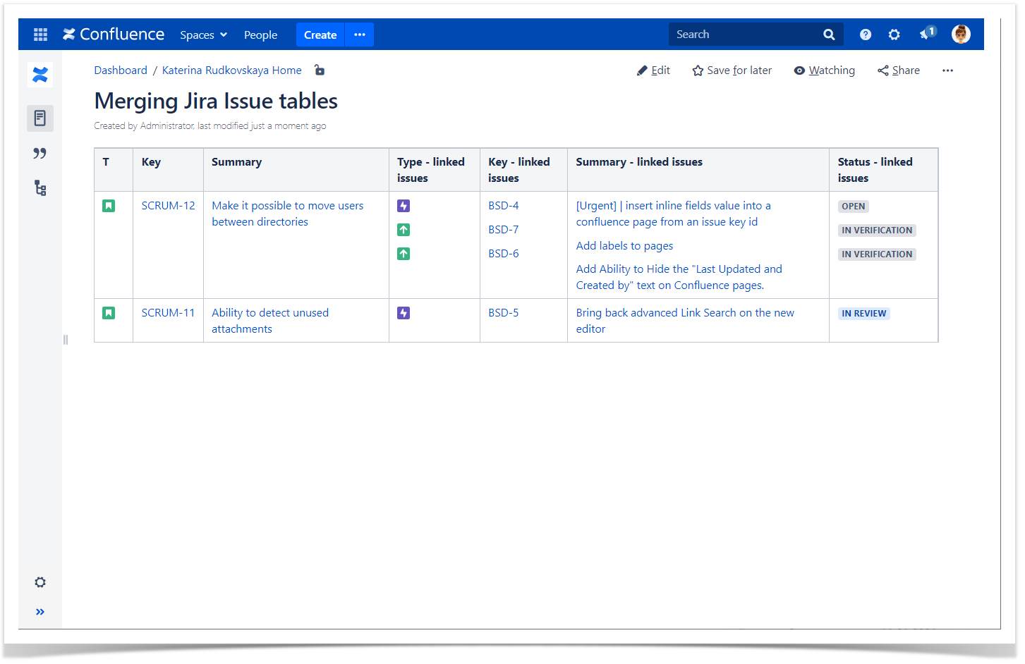 SELECT T1.'T',T1.'Key',T1.'Summary', CONCAT_VIEW_AGGR(FORMATWIKI(T2.'T' , " \n")) AS 'Type - linked issues', CONCAT_VIEW_AGGR(FORMATWIKI(T2.'Key', " \n")) AS 'Key - linked issues', CONCAT_VIEW_AGGR(FORMATWIKI(T2.'Summary', " \n")) AS 'Summary - linked issues', CONCAT_VIEW_AGGR(FORMATWIKI(T2.'Status', " \n")) AS 'Status - linked issues' FROM T1 LEFT JOIN T2 ON T1.'Linked Issues'->split(" , ")->indexOf(T2.'Key'::string) > -1 GROUP BY T1.'Key', T1.'T',T1.'Summary'The joining may be also done using the following functions: