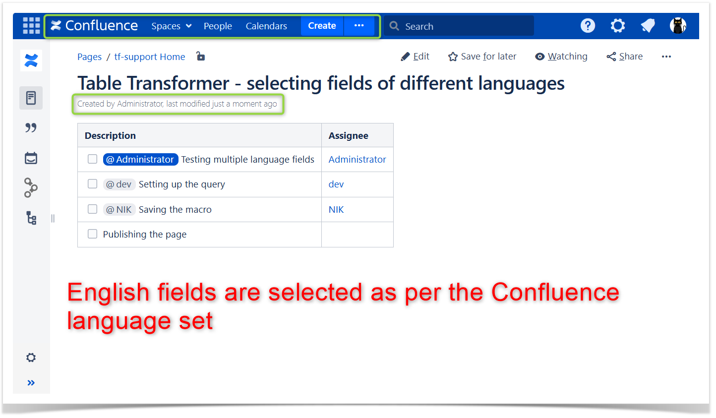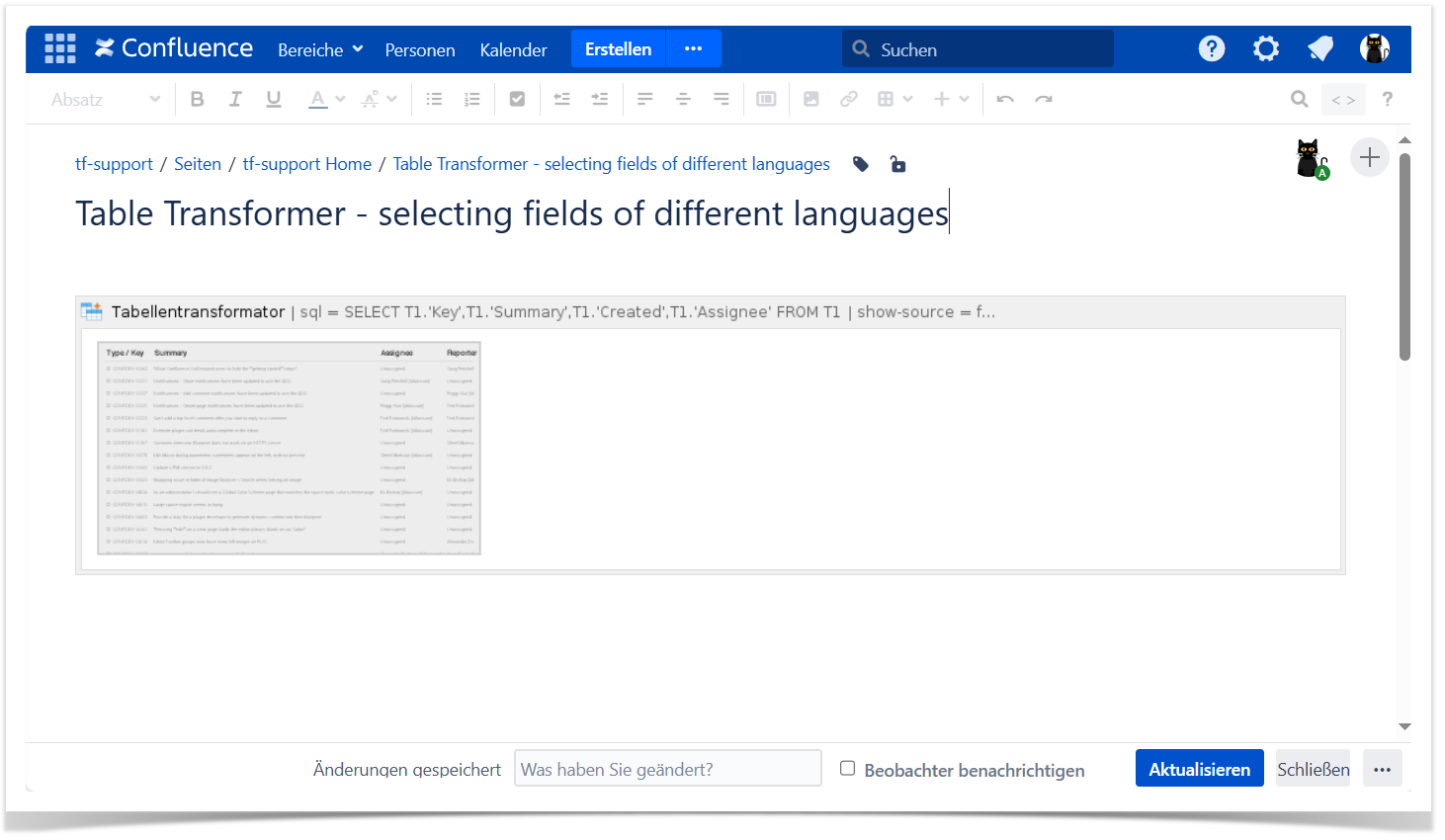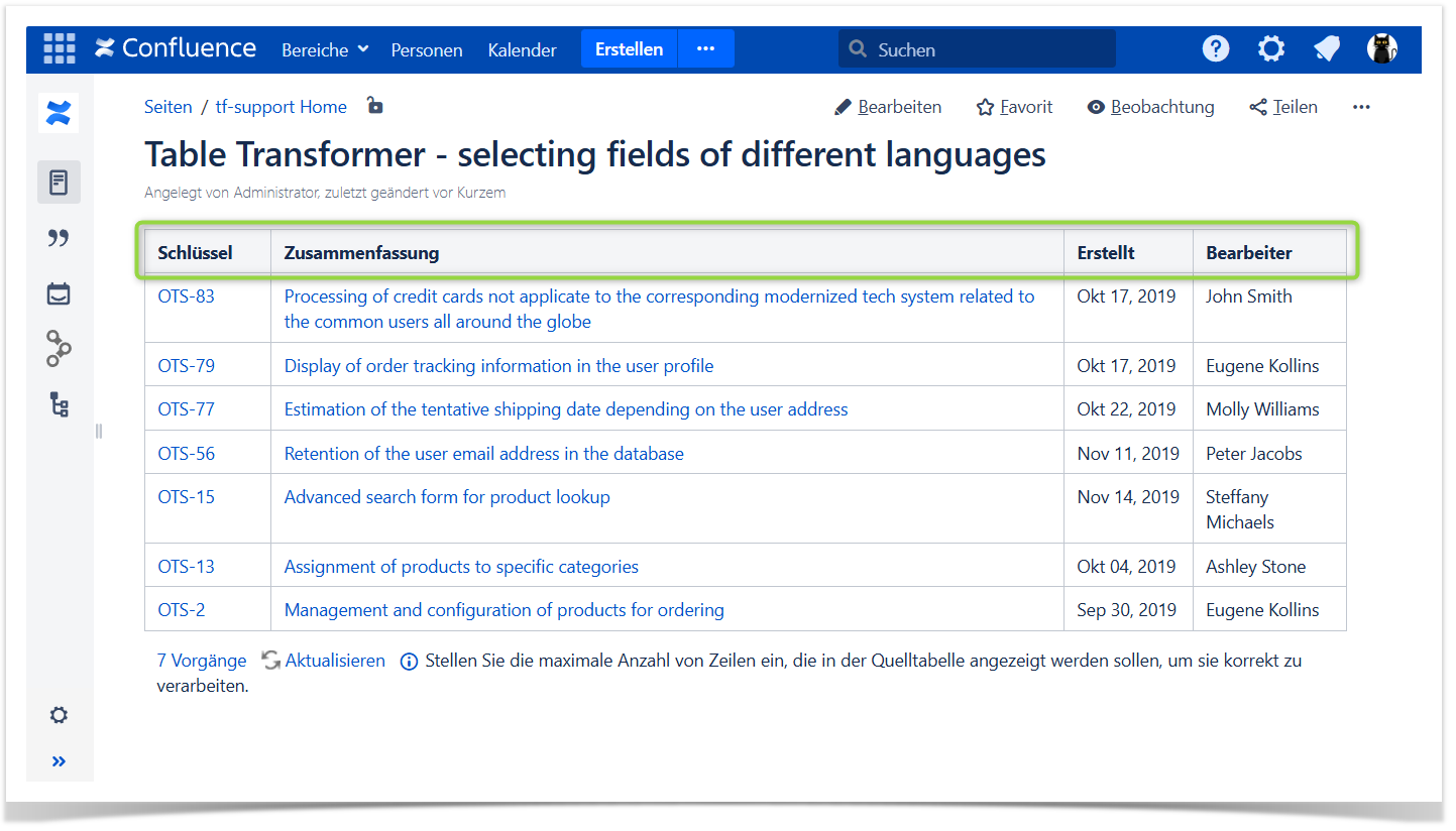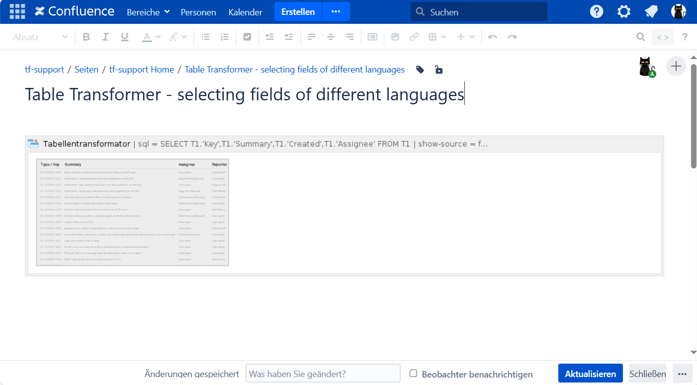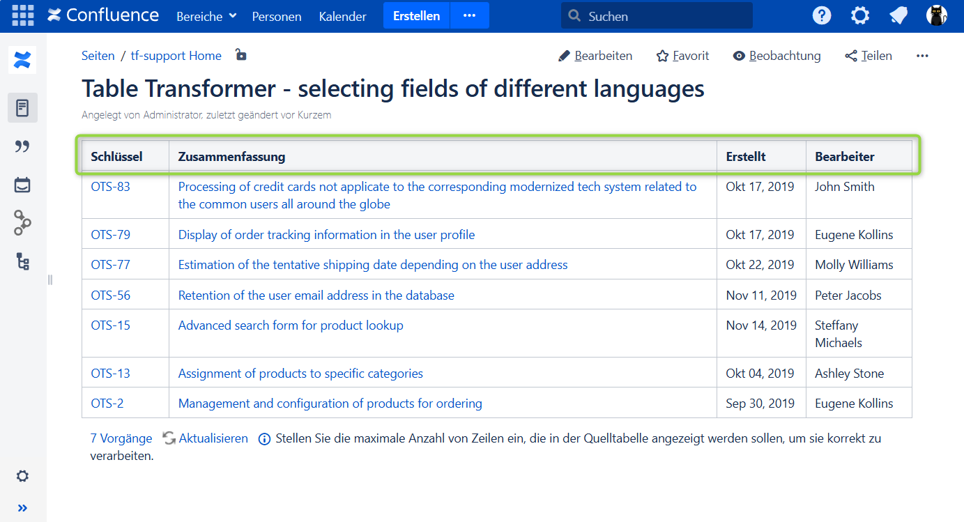 Though the use case is applicable to any table returning macros automatically translating their fields correspondingly upon the language switching, there is no need to utilize it when processing the standard Jira Issues fields, such as Key, Summary, Created, Updated, Due, Assignee, etc. - Table Transformer is able to render these fields in any Confluence language set with no specific language assignment, meaning you can select the fields in English with a German language in Confluence, for example - the selection will still take place.