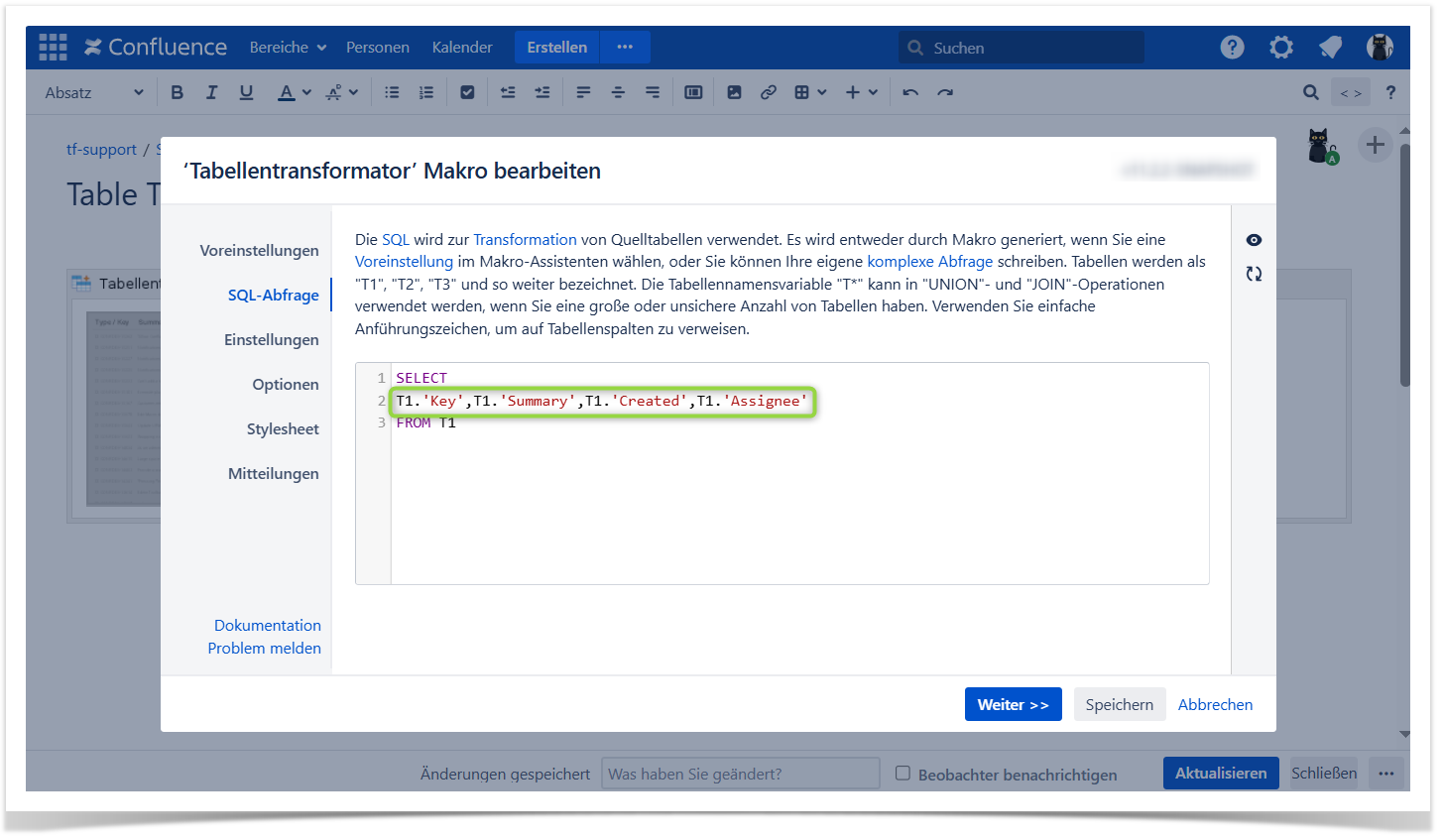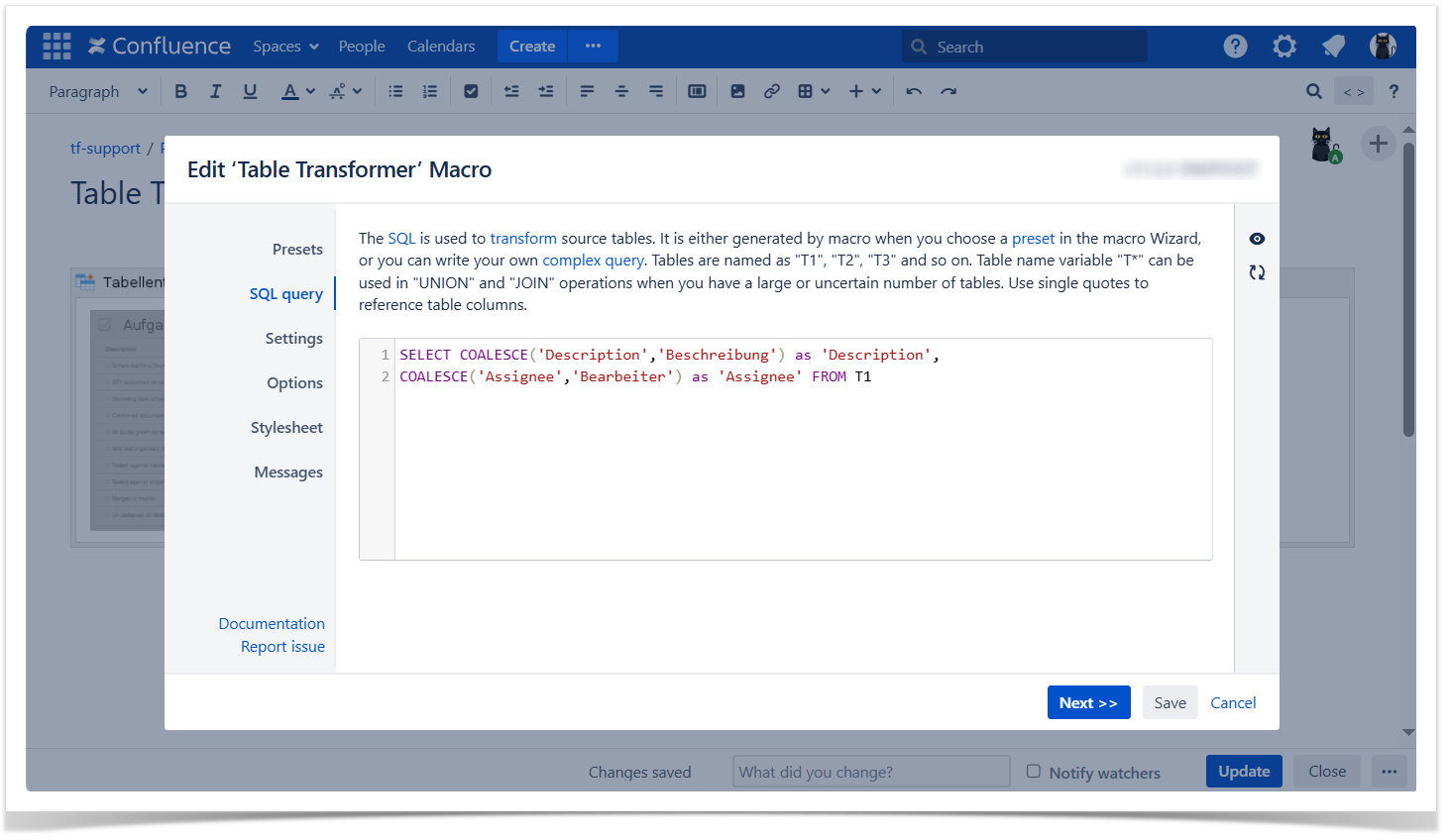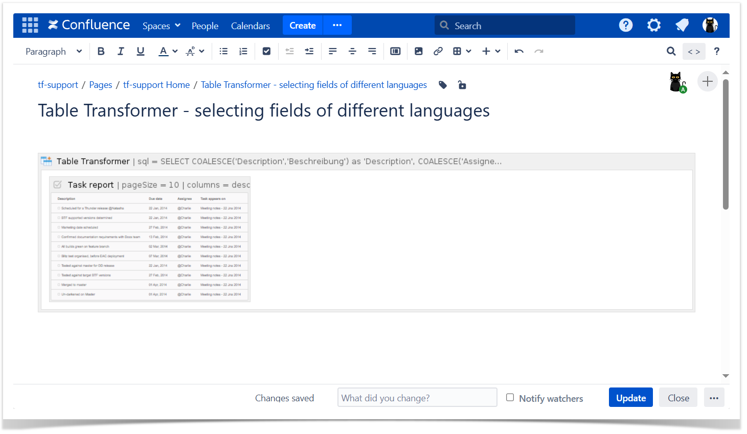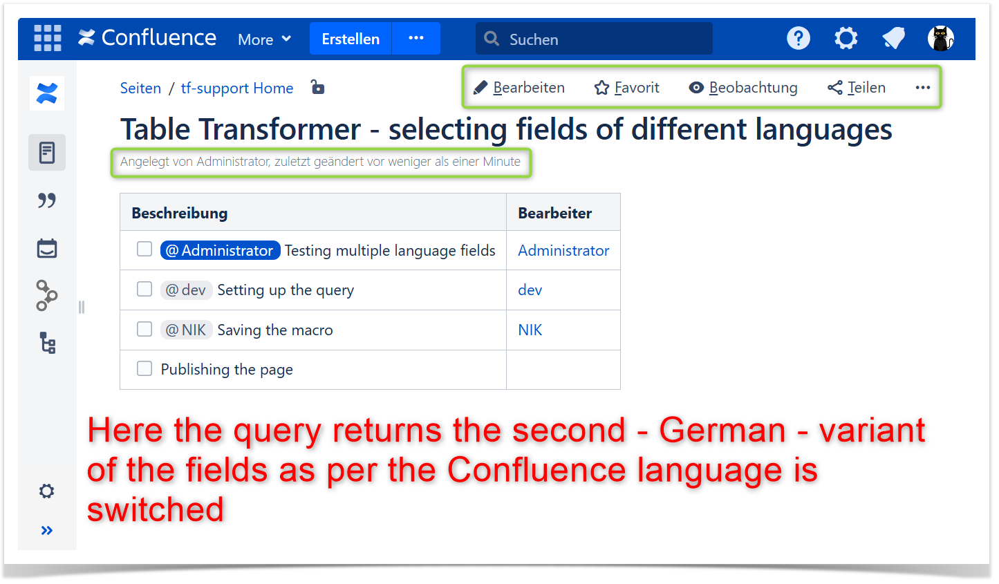 Though the use case is applicable to any table returning macros automatically translating their fields correspondingly upon the language switching, there is no need to utilize it when processing the standard Jira Issues fields, such as Key, Summary, Created, Updated, Due, Assignee, etc. - Table Transformer is able to render these fields in any Confluence language set with no specific language assignment, meaning you can select the fields in English with a German language in Confluence, for example - the selection will still take place.