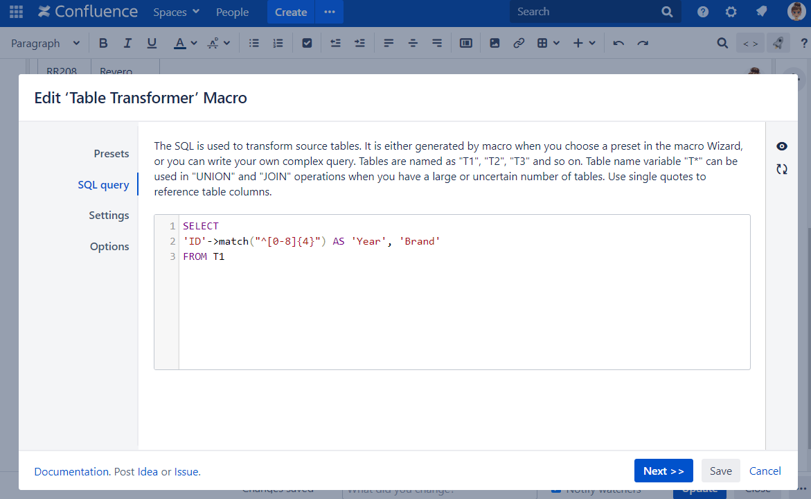 SELECT 'ID'->match("^[0-8]{4}") AS 'Year', 'Brand' FROM T1- Save the macro and the page.