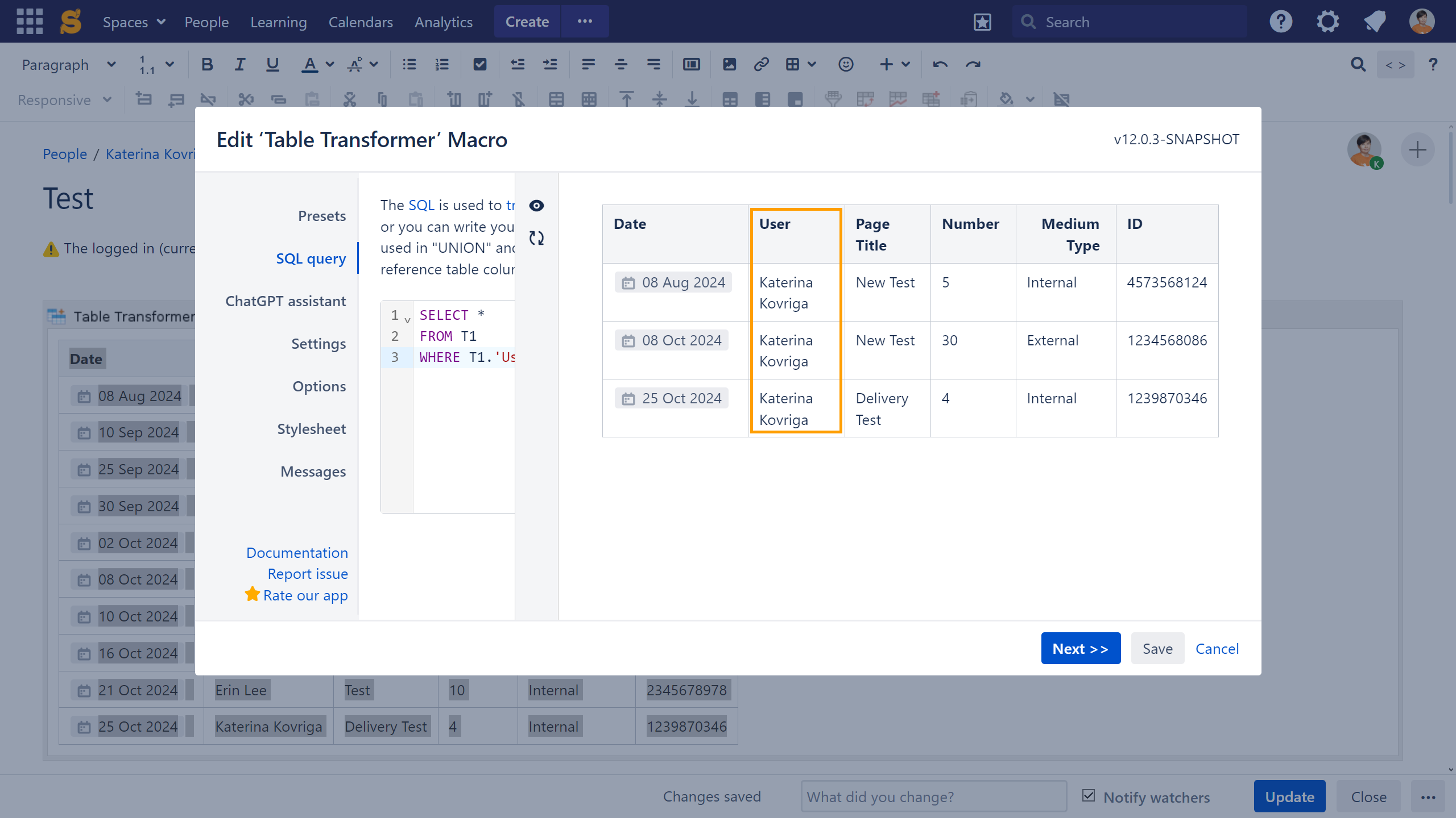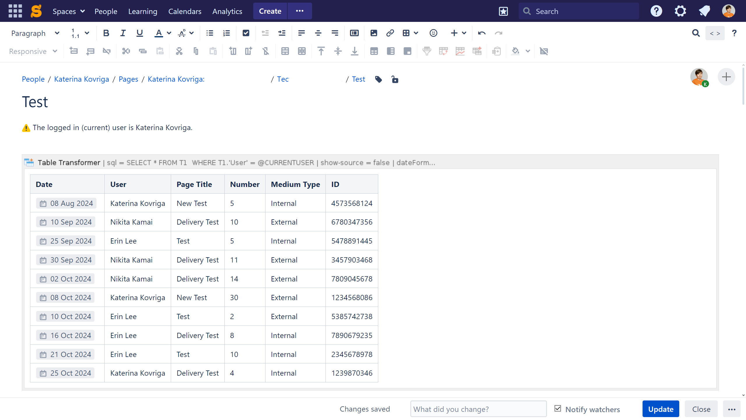- Add the current page title (i.e. where the current Confluence user is now) to all the existing page names in the 'Page' table column