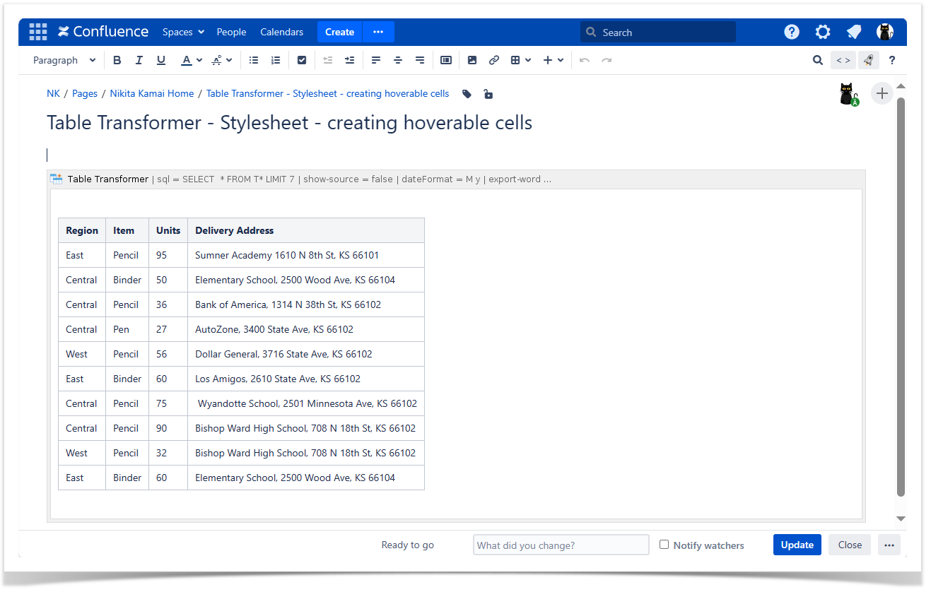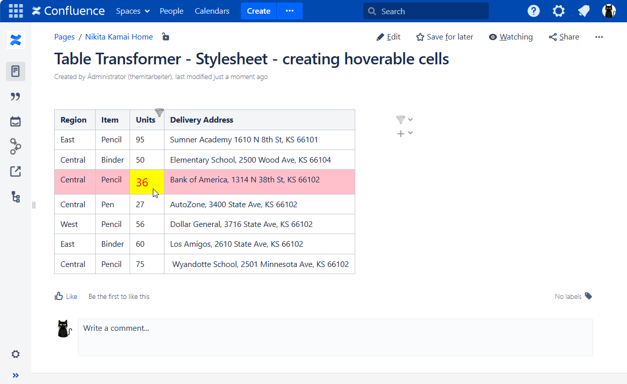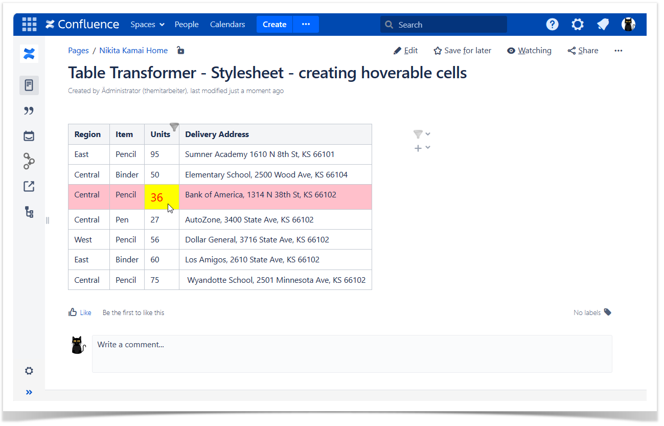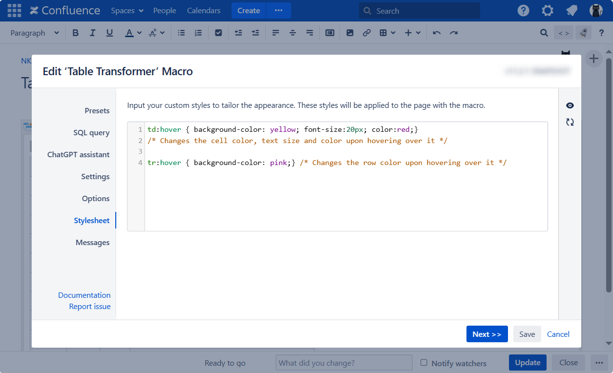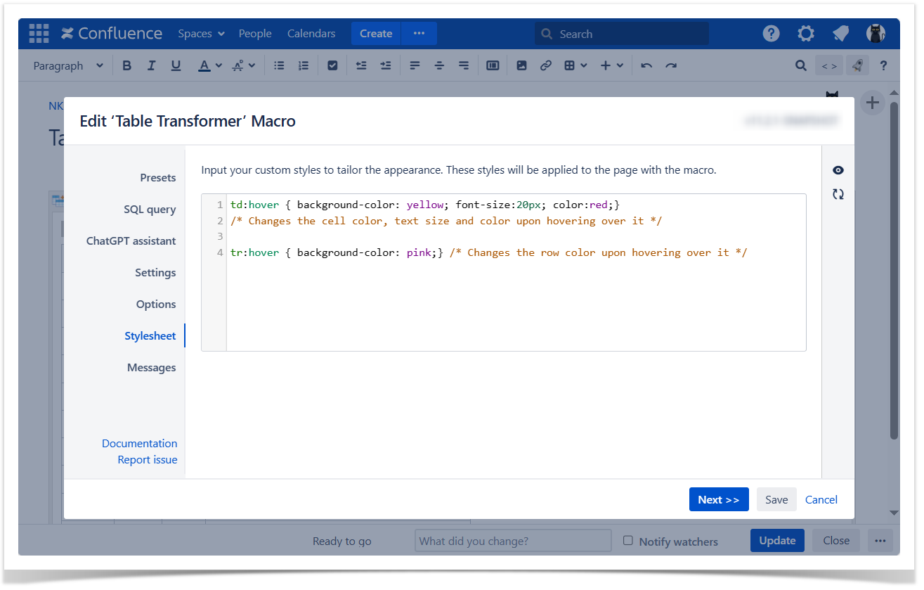 td:hover {background-color: yellow; font-size:20px; color:red;} /* Changes the cell color, text size and color upon hovering over it */ tr:hover {background-color: pink;} /* Changes the row color upon hovering over it */Save the macro and the page.