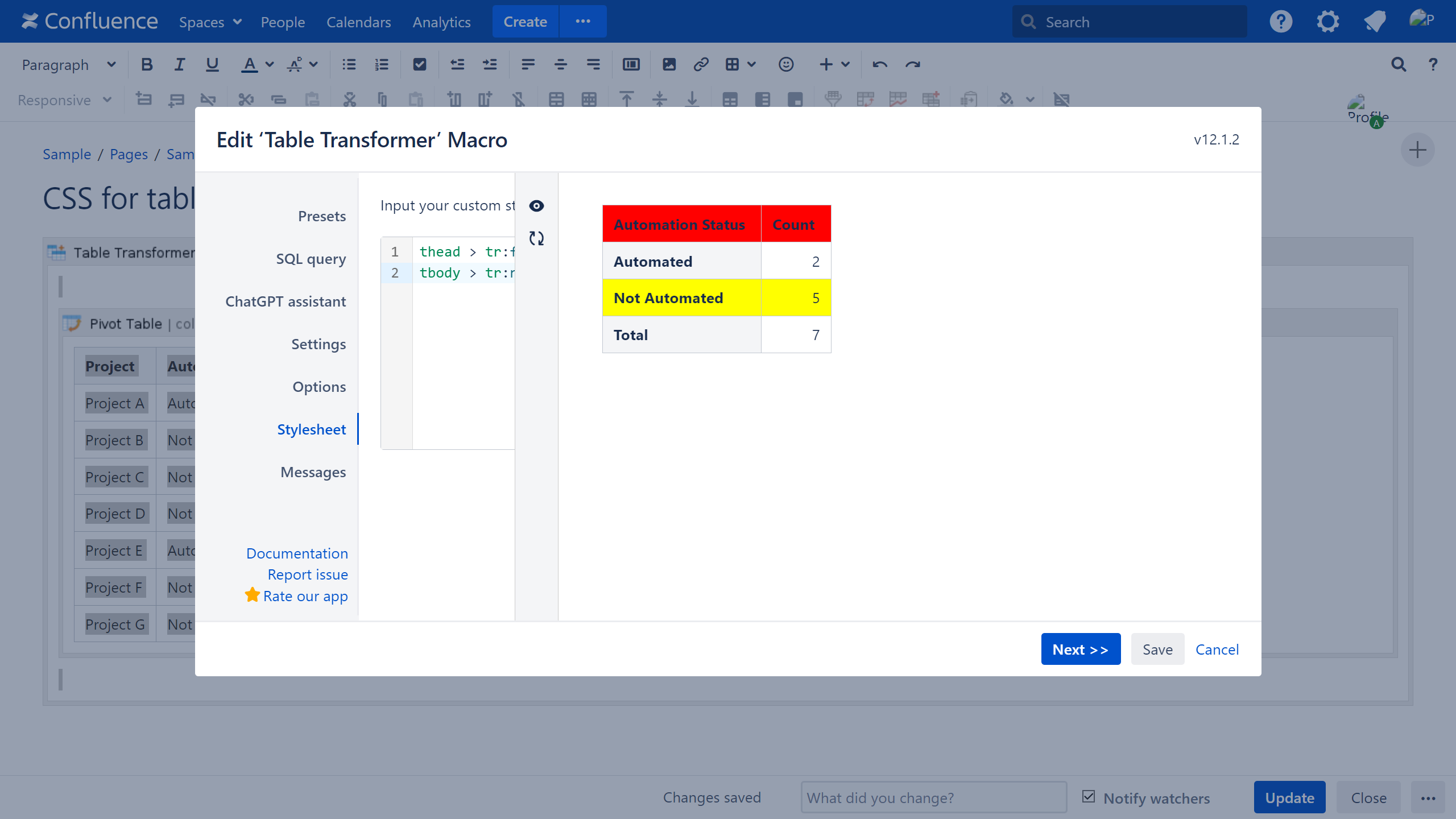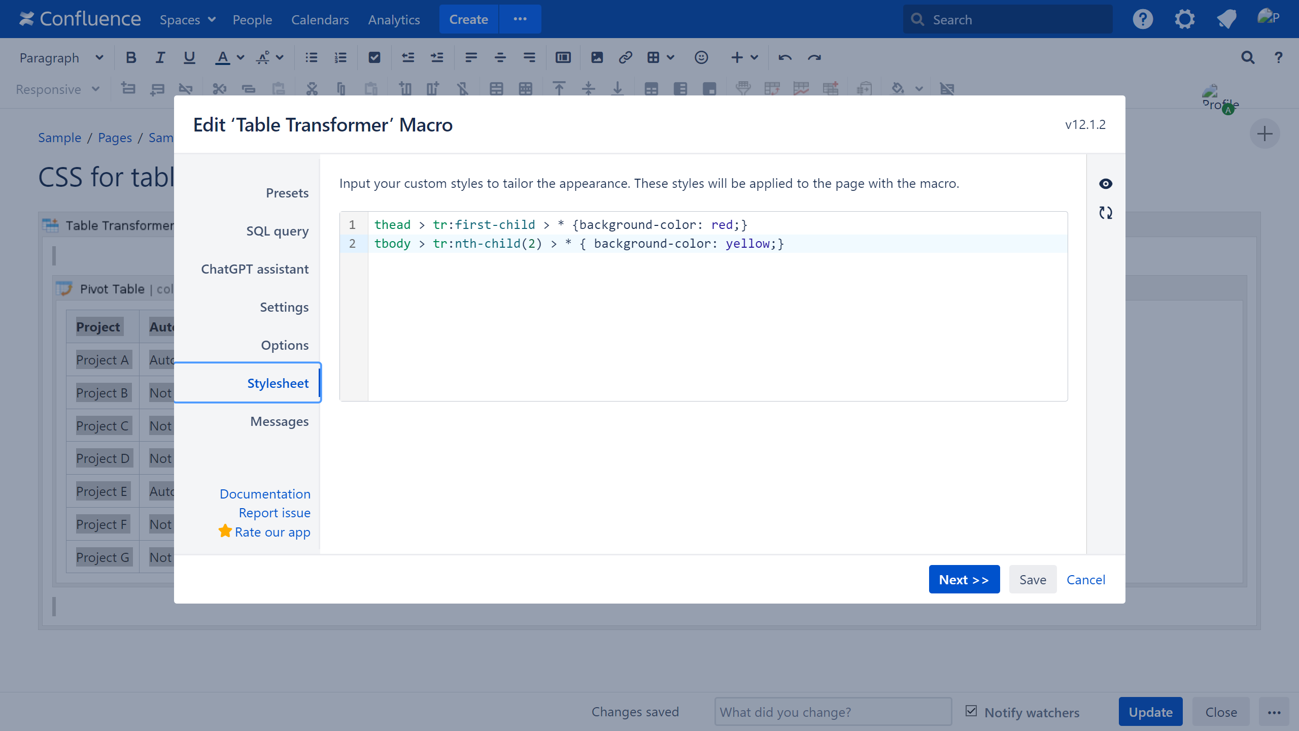 thead > tr:first-child > * {background-color:red;} /* Adjusts the background color of the first header row */ tbody > tr > * {background-color:yellow;} /* Adjusts the background color of the table rows */ tbody > tr:nth-child(2) > * { background-color:yellow;} /* Adjusts the background color of the specific table rows (the second row for this example) */Save the macro and the page.