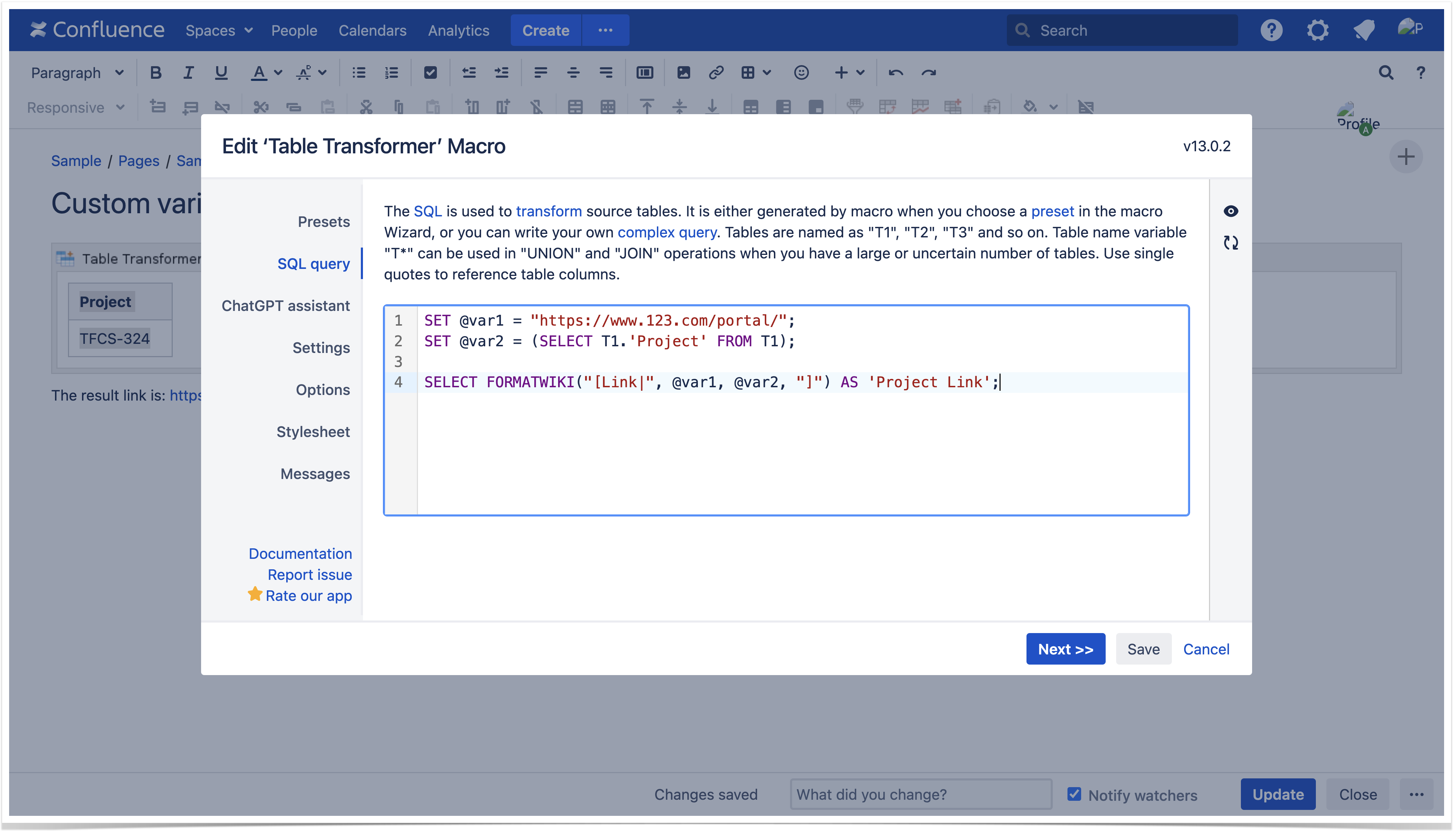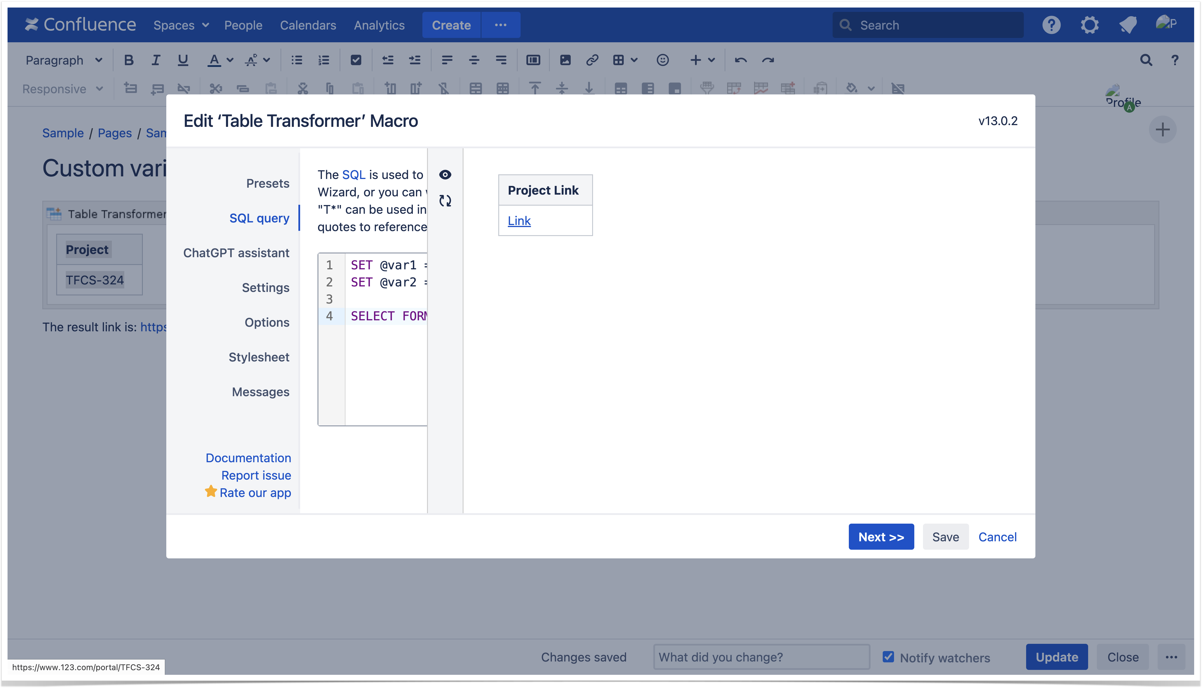 SELECT FORMATWIKI("[Link|", @var1, @var2, "]") AS 'Project Link';
