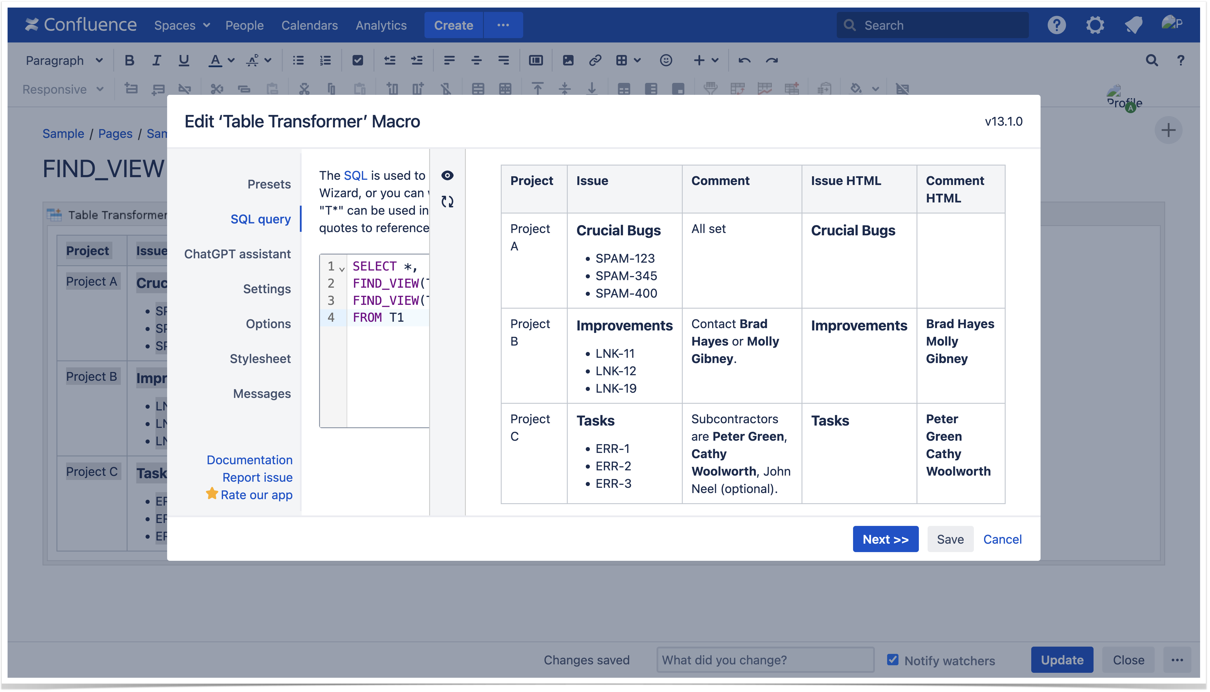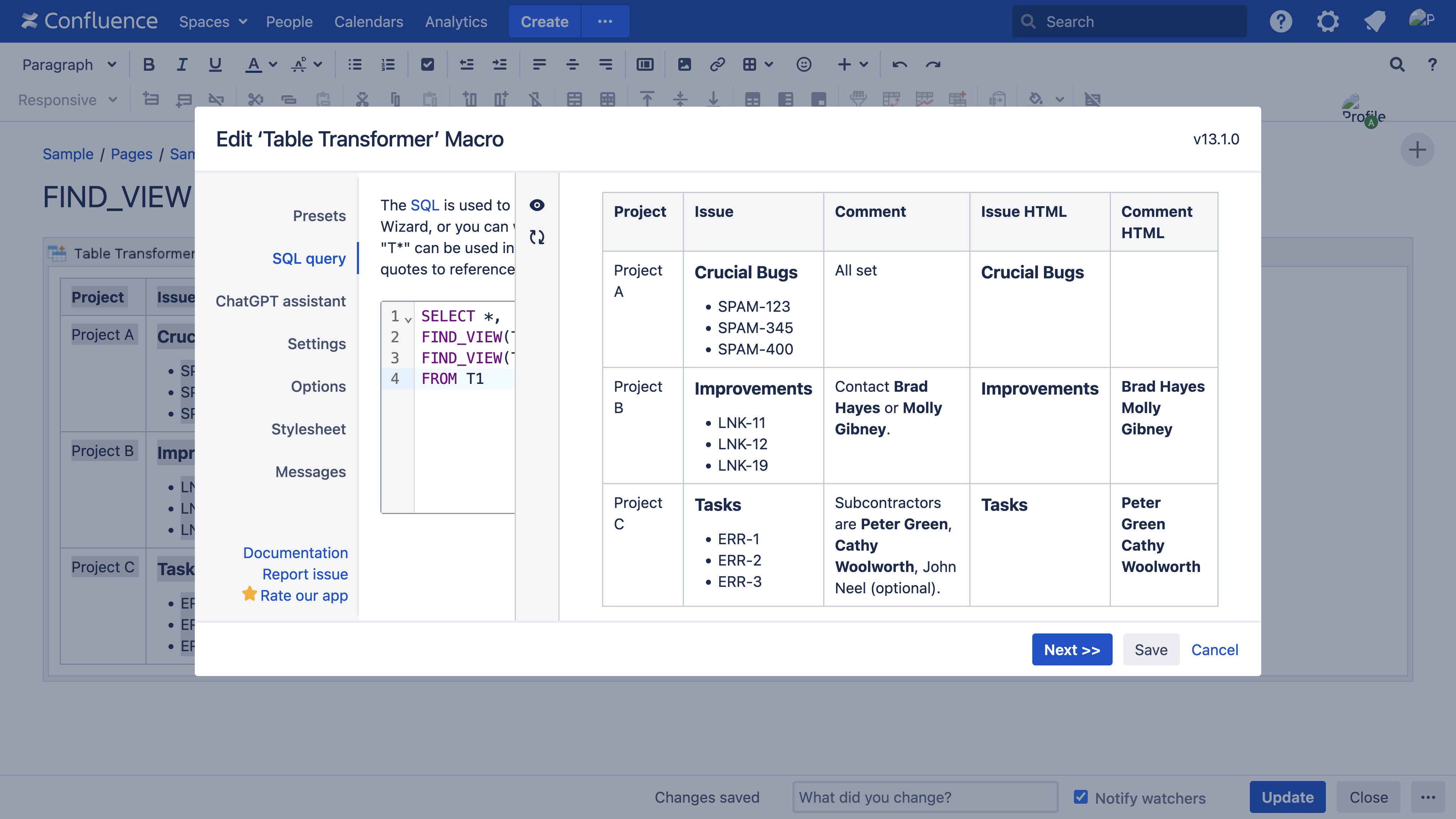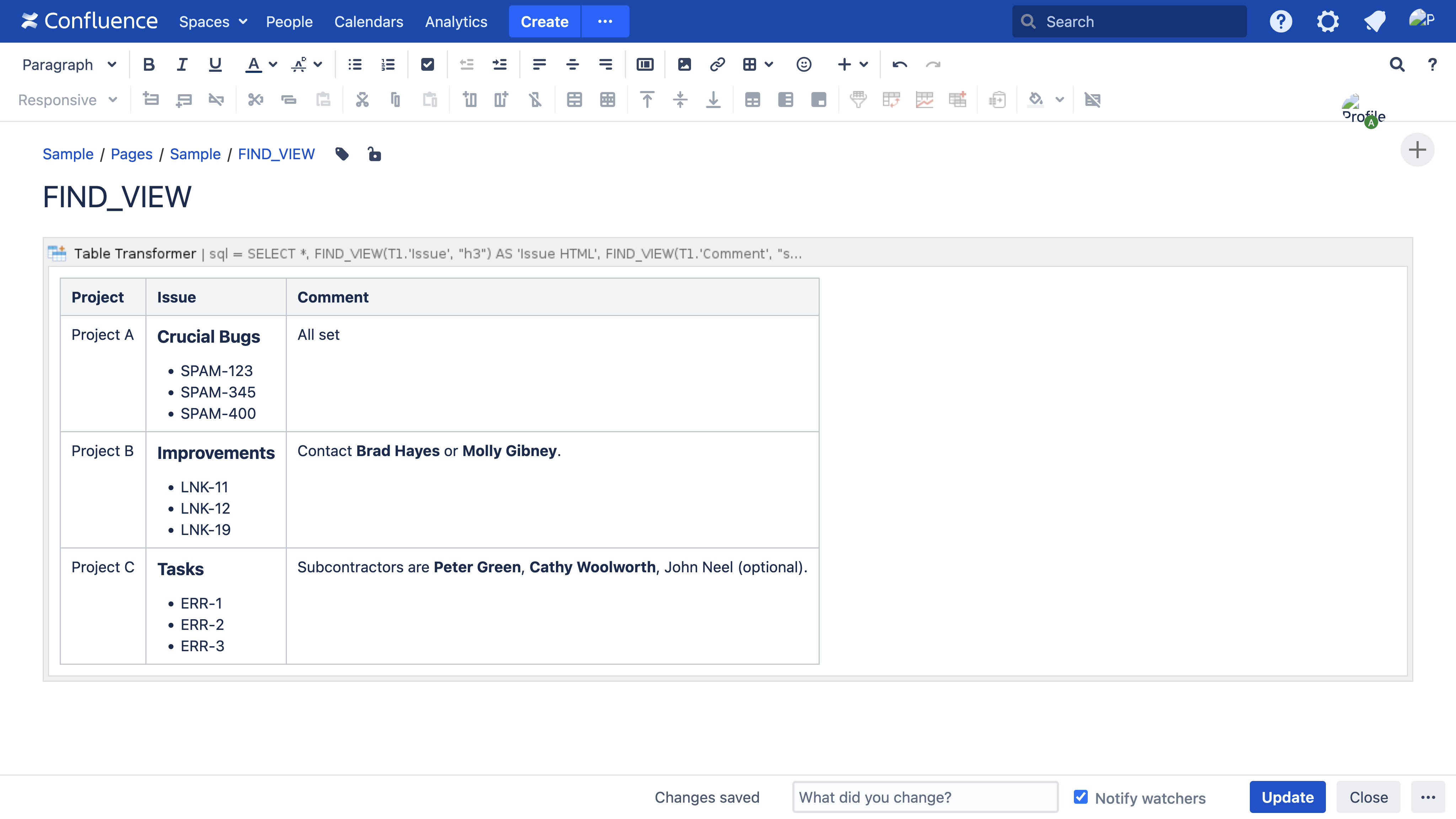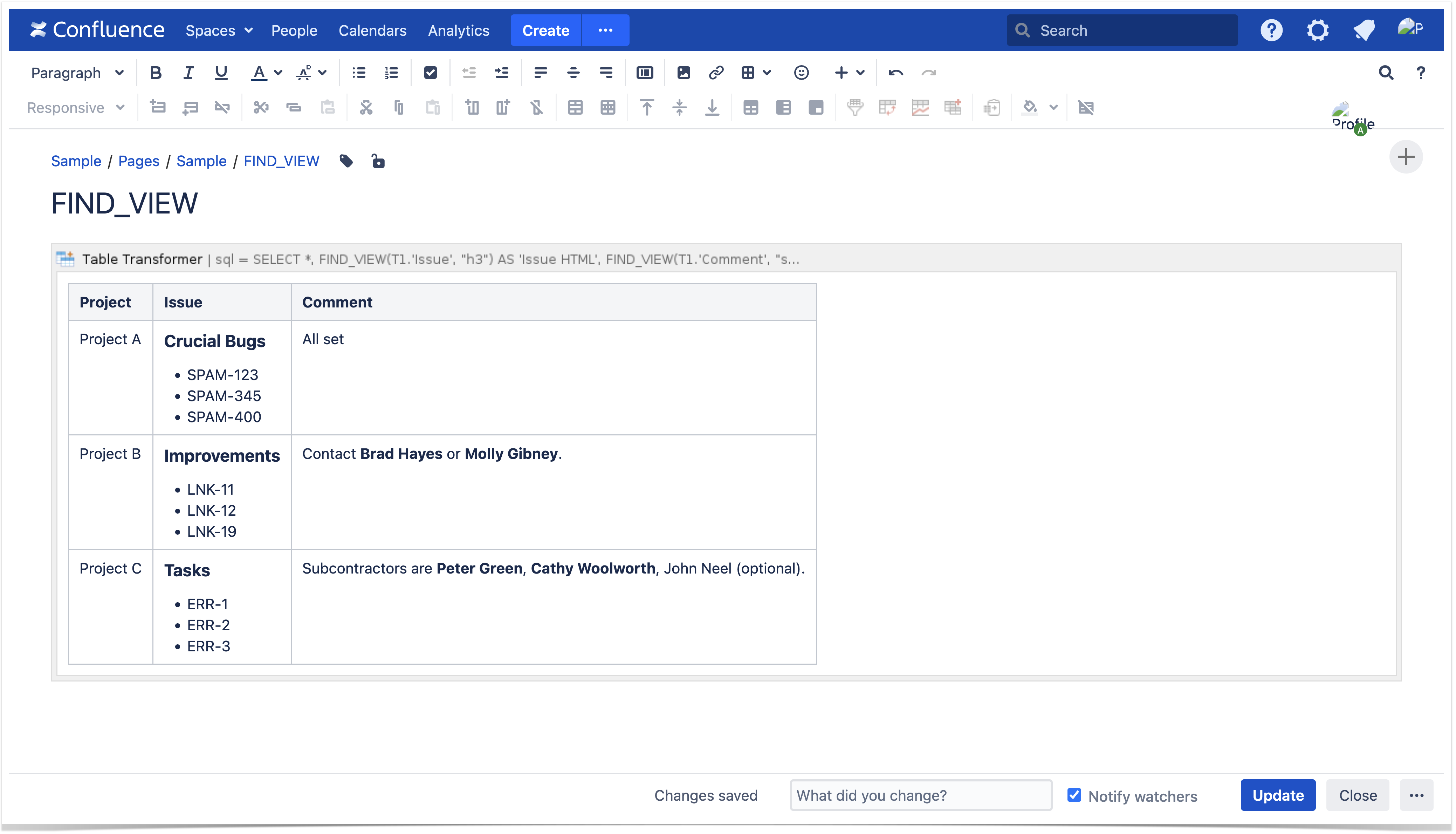 SELECT *, FIND_VIEW(T1.'Issue', "h3") AS 'Issue HTML', FIND_VIEW(T1.'Comment', "strong", true) AS 'Comment HTML' FROM T1