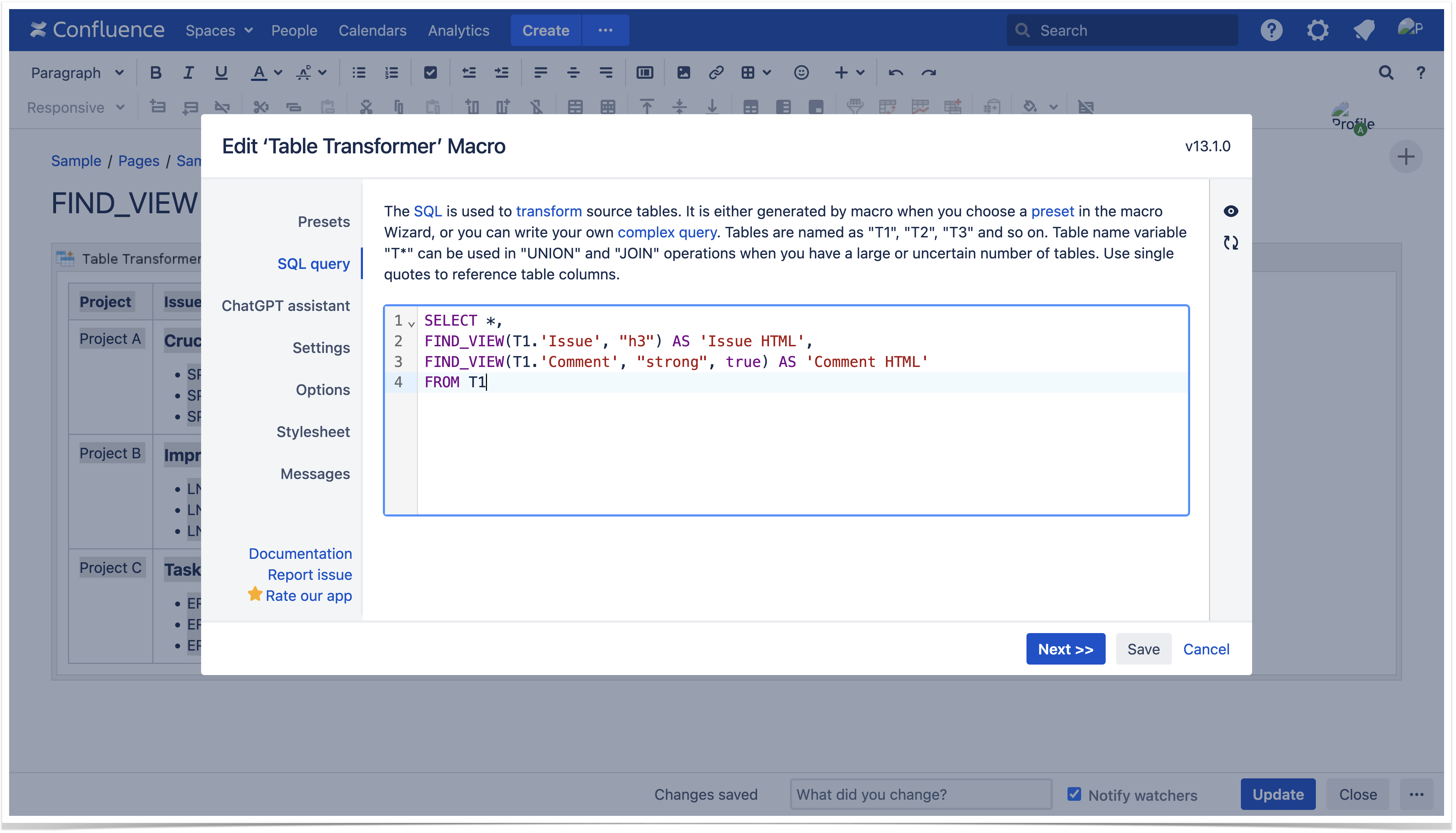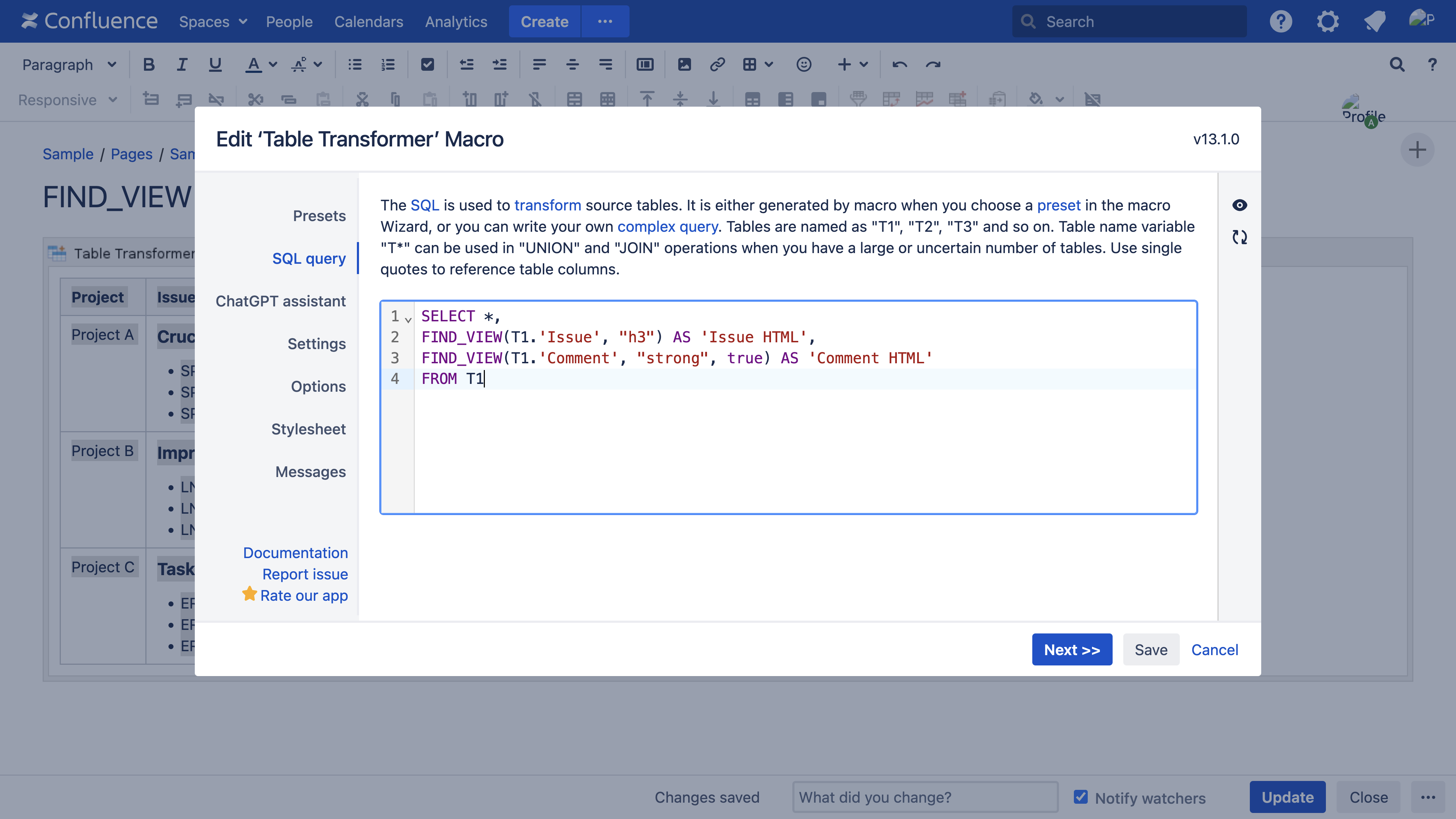 - Insert the Table Transformer macro and paste the table or the macros outputting tables within the macro body.