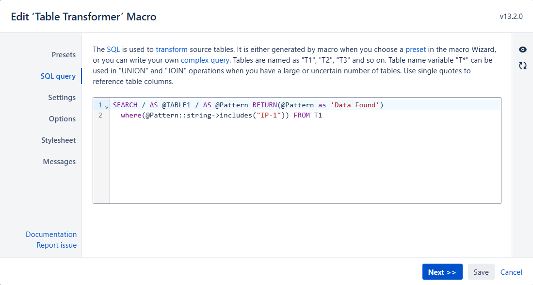 SEARCH / AS @TABLE1 / AS @Pattern RETURN(@Pattern as 'Data Found') where(@Pattern::string->includes("IP-1")) FROM T1- Save the macro and the page.