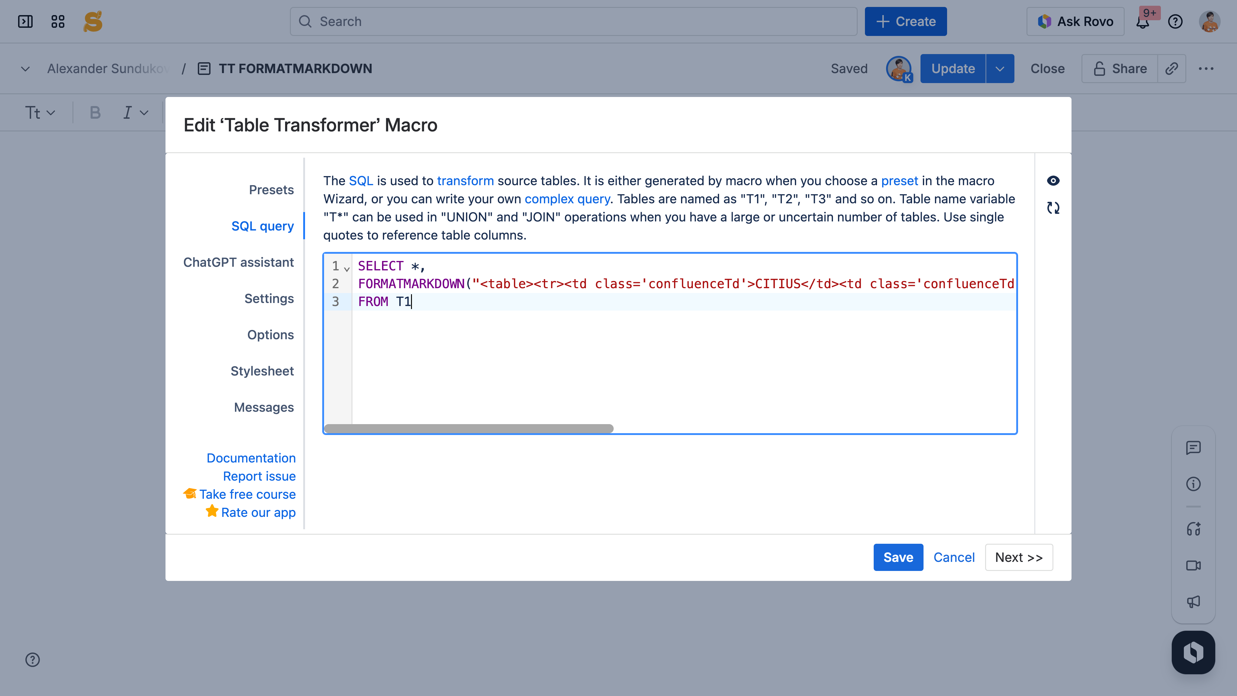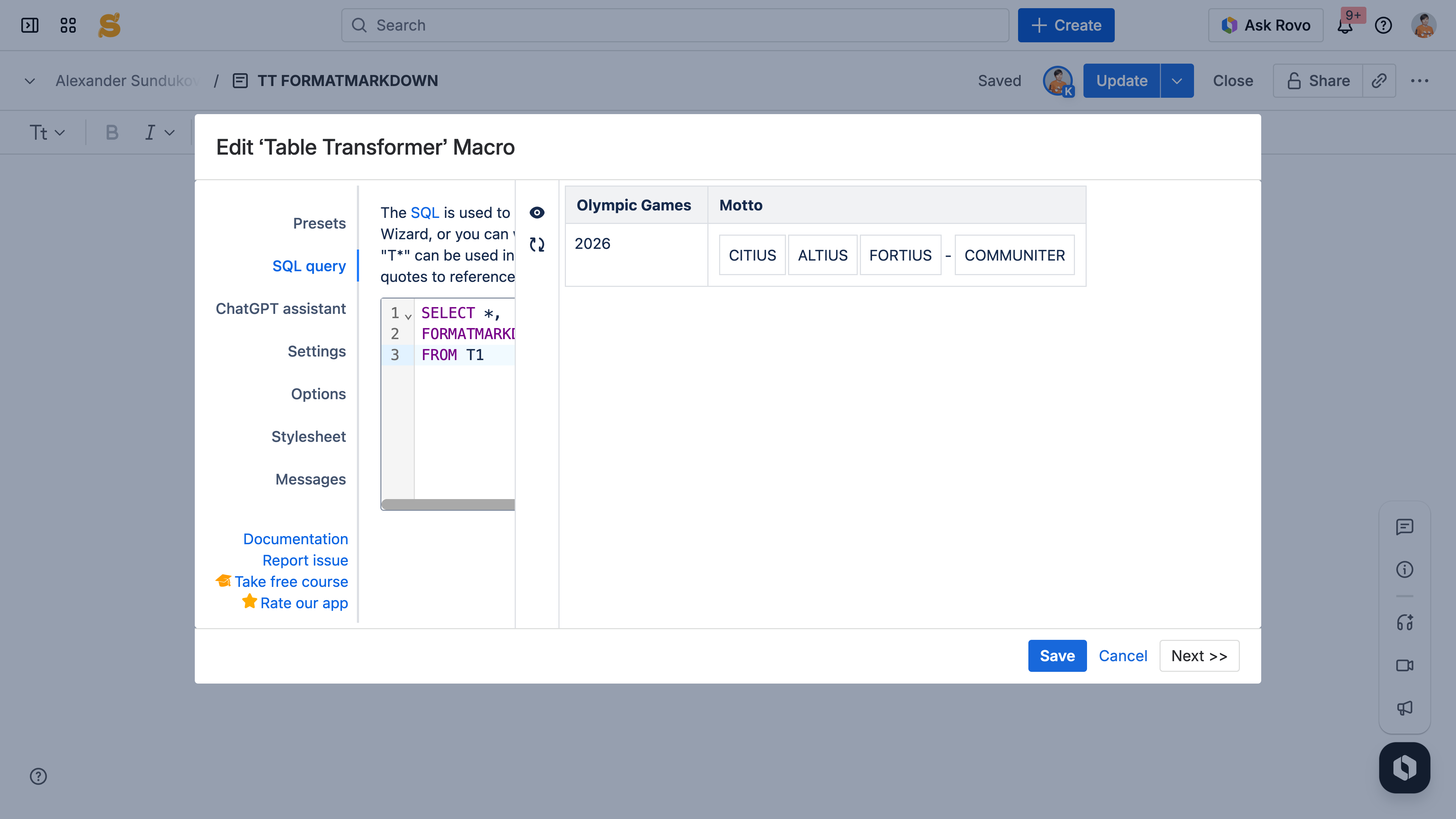 SELECT *, FORMATMARKDOWN("<table><tr><td class='confluenceTd'>CITIUS</td><td class='confluenceTd'>ALTIUS</td><td class='confluenceTd'>FORTIUS</td><td>-</td><td class='confluenceTd'>COMMUNITER</td></tr></table>") AS 'Motto' FROM T1Save the macro and the page.