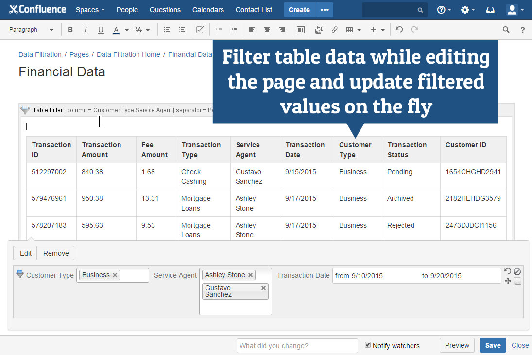 Now you can easily work with your table data while editing or viewing Confluence pages.
