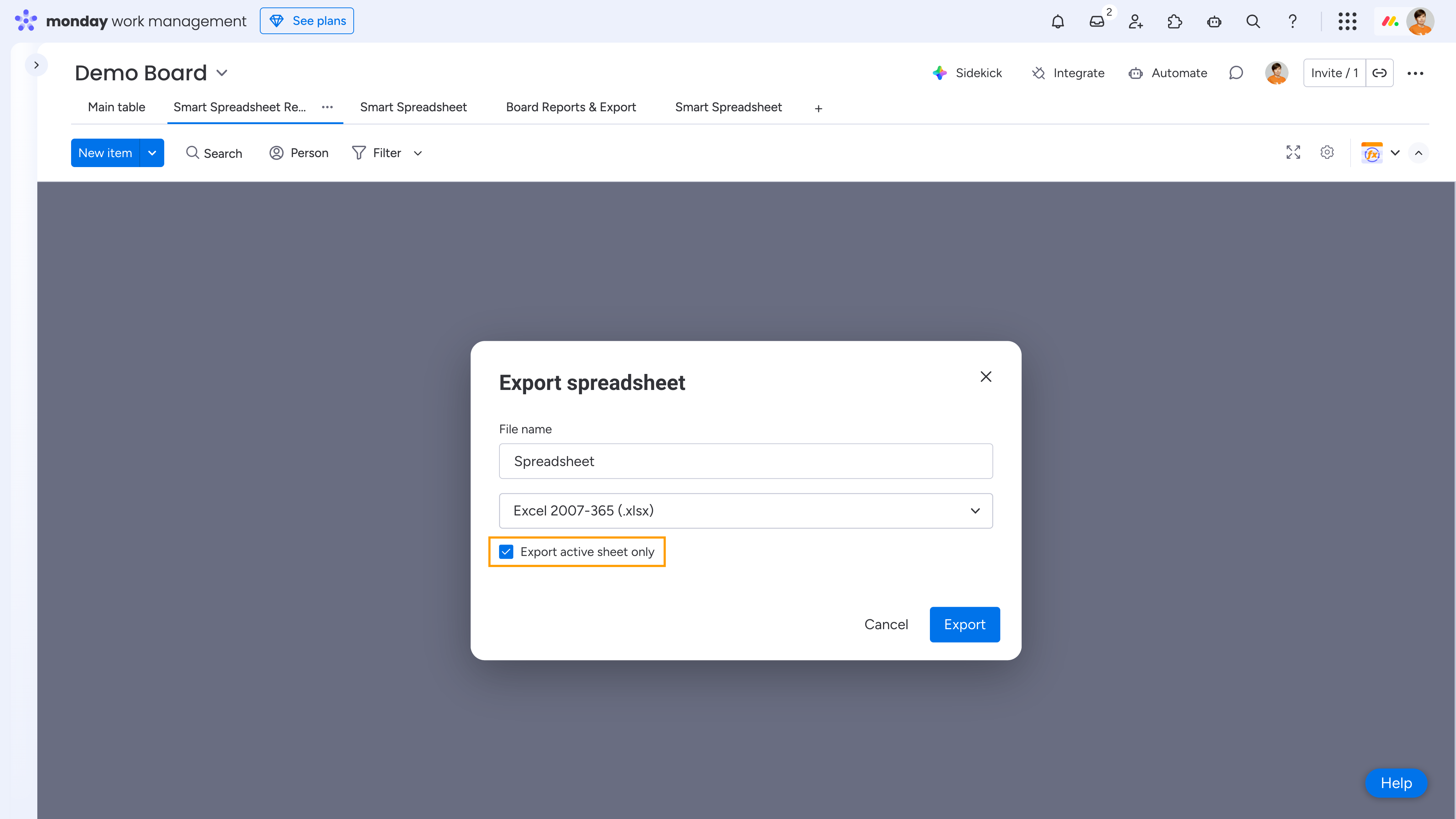 Note that for .xlsx and .tfss exports, you can enable the option to export only the active (current) sheet. For .csv exports, this option does not appear, because the CSV format supports exporting only the active sheet by design.
