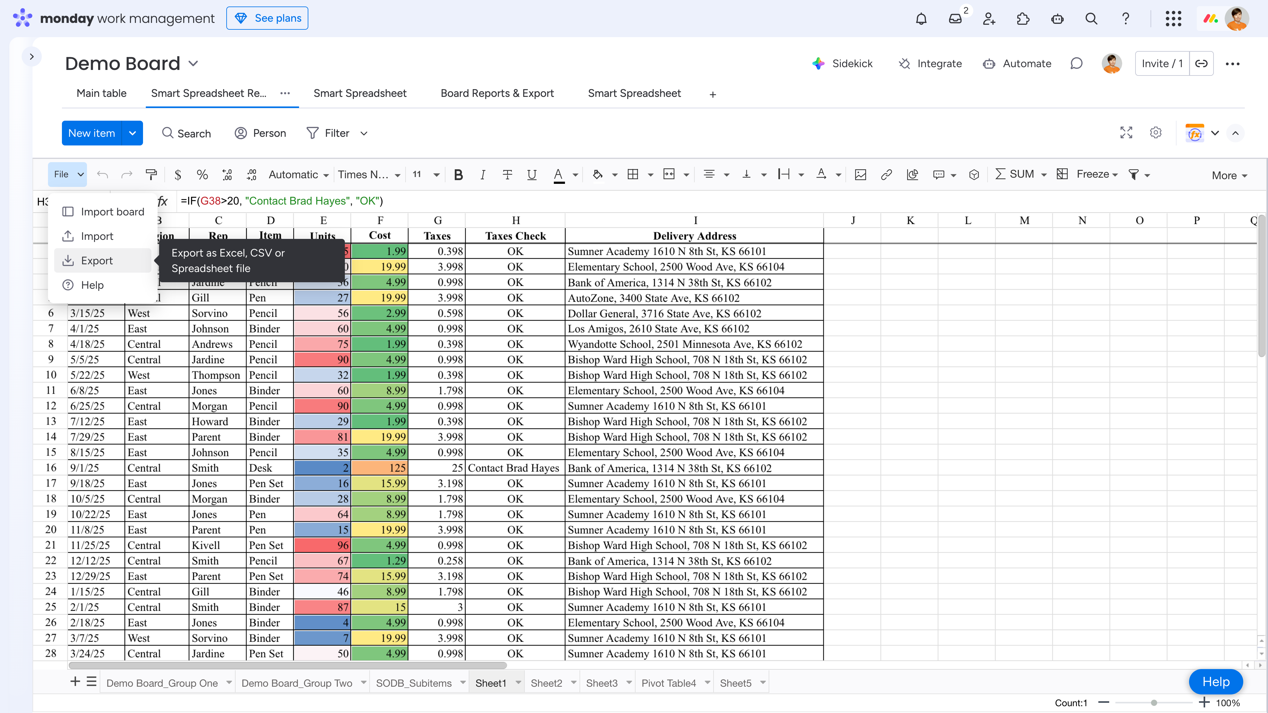 The Smart Spreadsheetallows you to add an Excel-like spreadsheet. You can work with it via a Board View, an Item View, a Custom Object, a Dashboard and a Doc Widget.