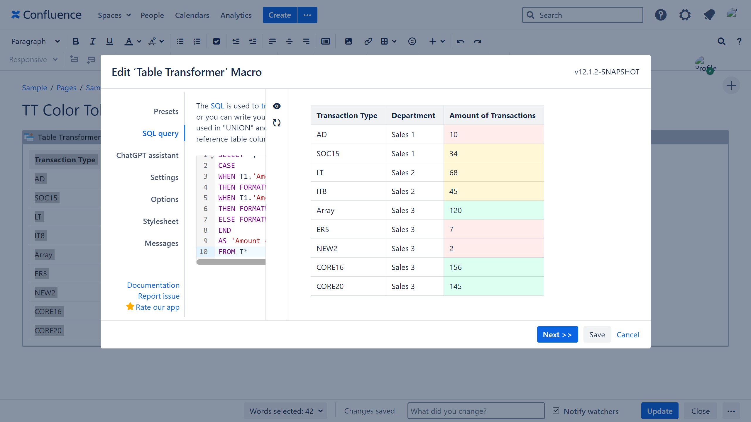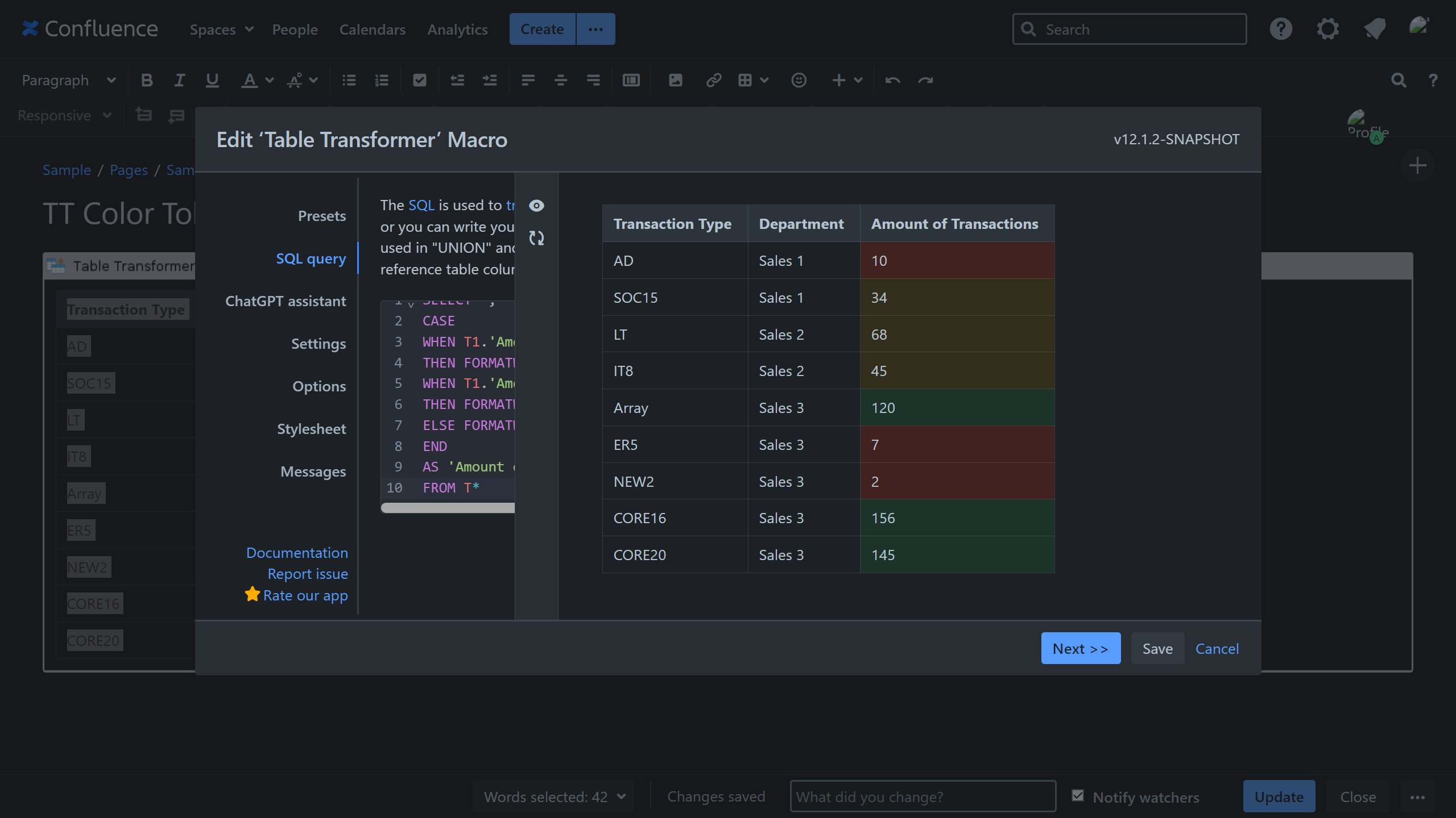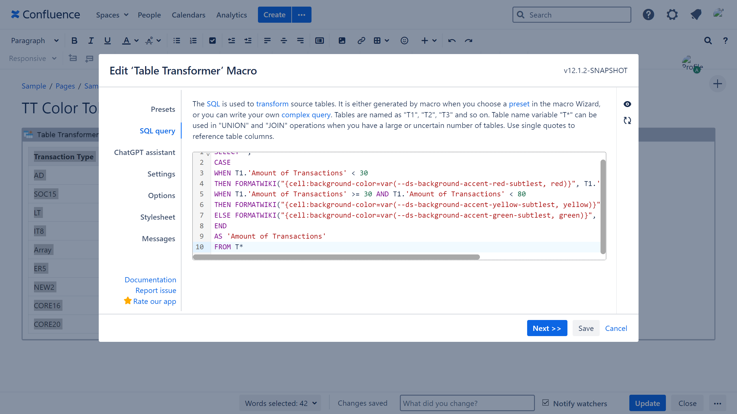THEN FORMATWIKI("{cell:background-color=var(--ds-background-accent-red-subtlest, red)}", T1.'Amount of Transactions', "{cell}")