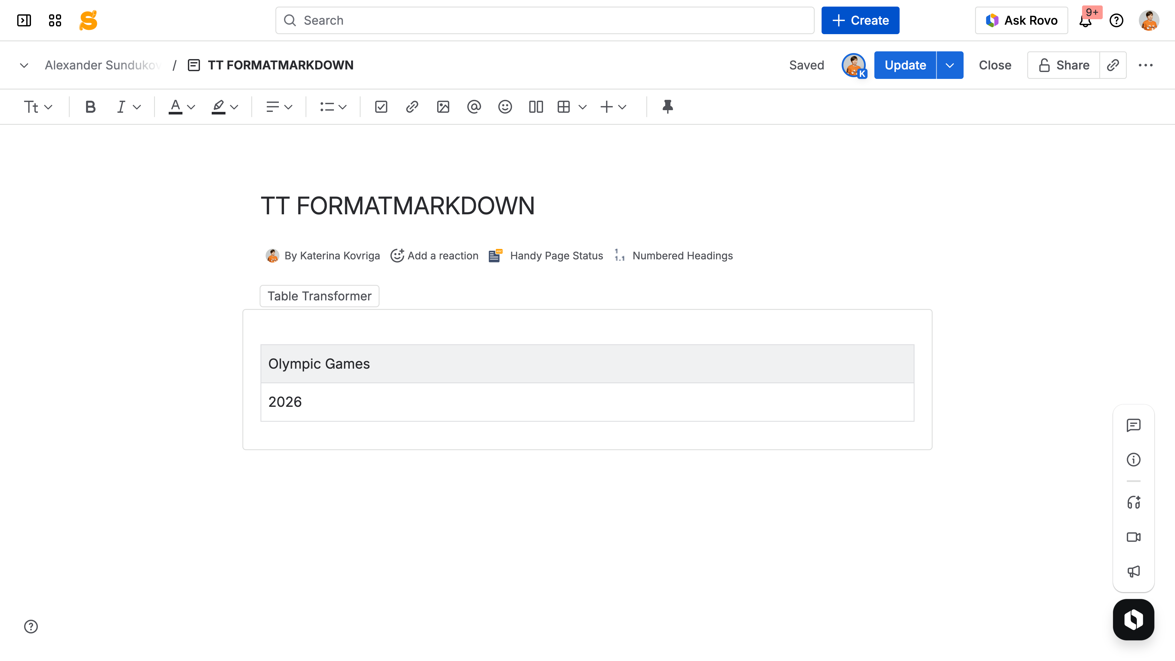 Table Filter, Charts & Spreadsheets for Confluence Table Transformer Custom Transformation - use cases with advanced SQL queries Advanced table cells formatting Current: Using HTML to format data PDF Download PDF Download page Using HTML to format data. Current page All pages Using HTML to format data Use caseYou want to create cells inside table cells to better structure your data. SolutionSwitch the page to the edit mode.Insert the Table Transformer macro and paste the table or the macros outputting tables within the macro body.Select the macro and click Edit.In the Presets tab select Custom transformation and click Next.Enter the following SQL query: SELECT *, FORMATMARKDOWN("<table><tr><td class='confluenceTd'>CITIUS</td><td class='confluenceTd'>ALTIUS</td><td class='confluenceTd'>FORTIUS</td><td>-</td><td class='confluenceTd'>COMMUNITER</td></tr></table>") AS 'Motto' FROM T1 SQL Save the macro and the page. ×
