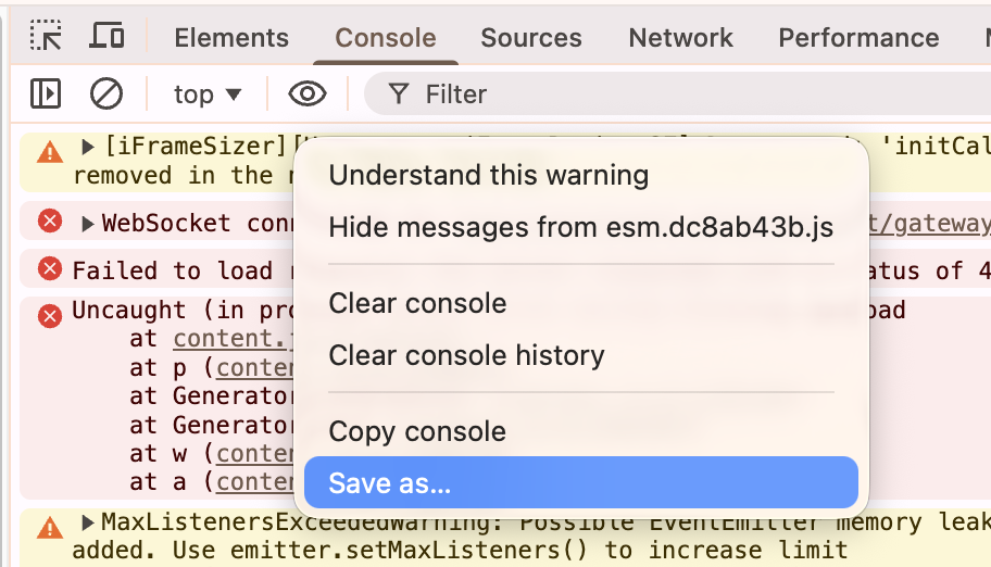 After reproducing the issue and saving the HAR file, switch to the Console tab, copy the logs from the browser console, and attach the corresponding file to the ticket as well.
