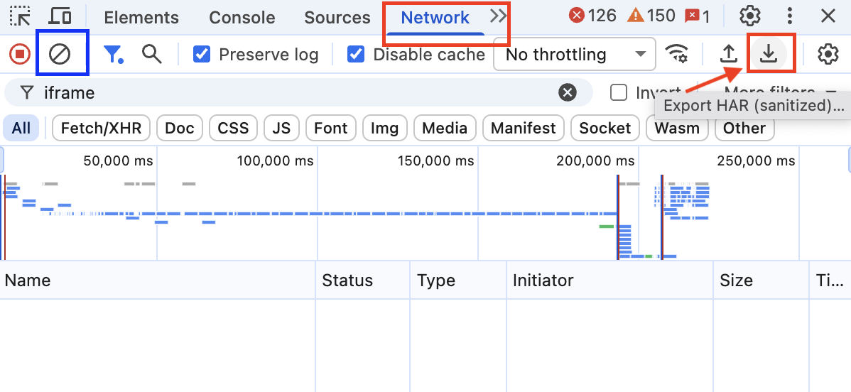5. Save data in the Network tab as a HAR file and attach it to the ticket