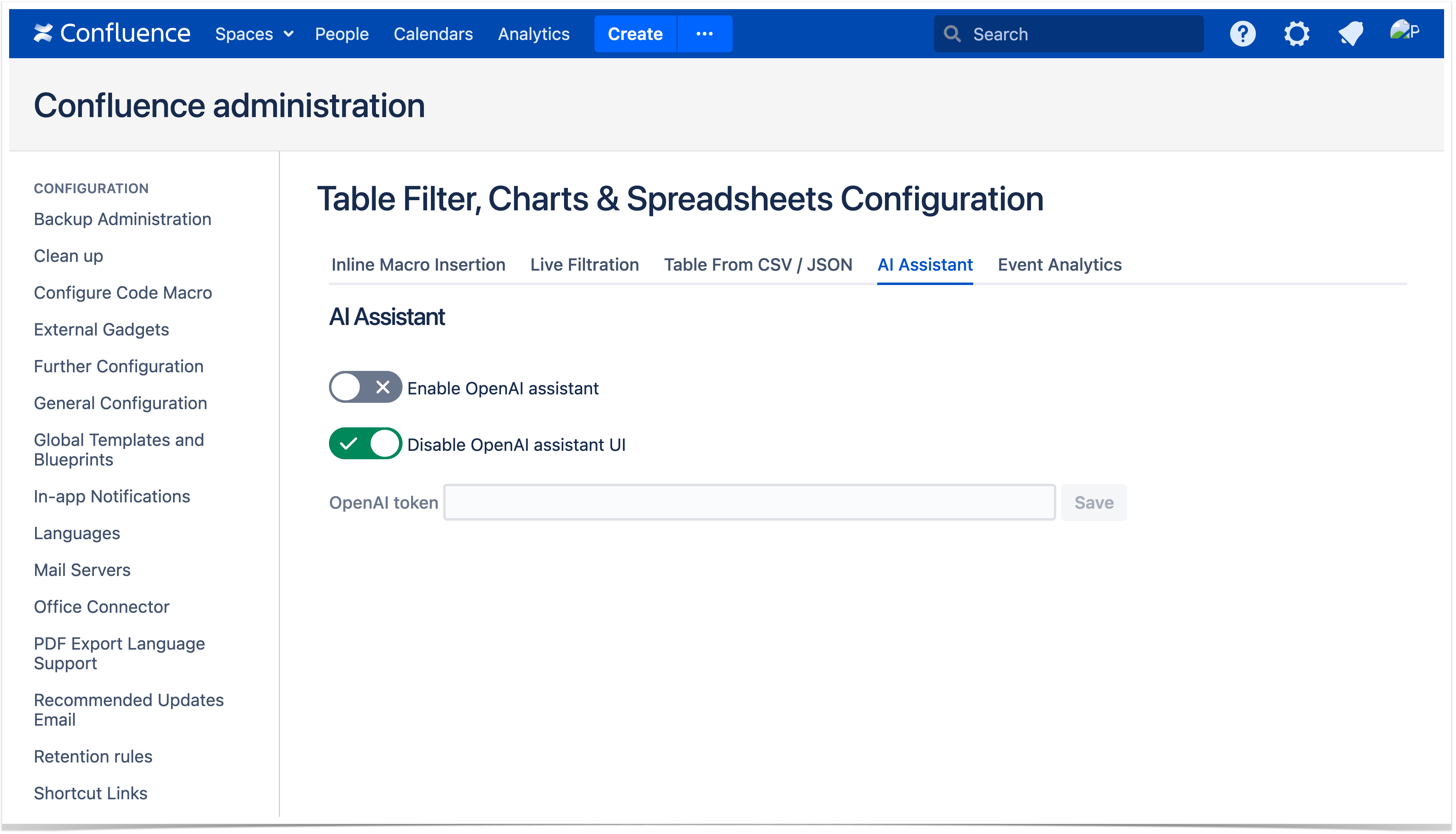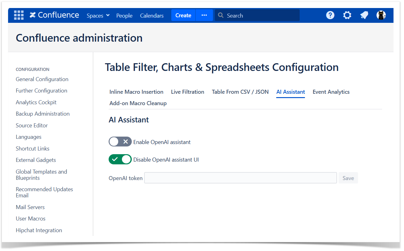 To completely hide all of the AI Assistant UI features within the app (i.e. Table Transformer's GPT Assistant, AI Table selection, Table Spreadsheet AI functions) toogle on the Disable OpenAI assistant UI once the Enable OpenAI assistant switch is off.
