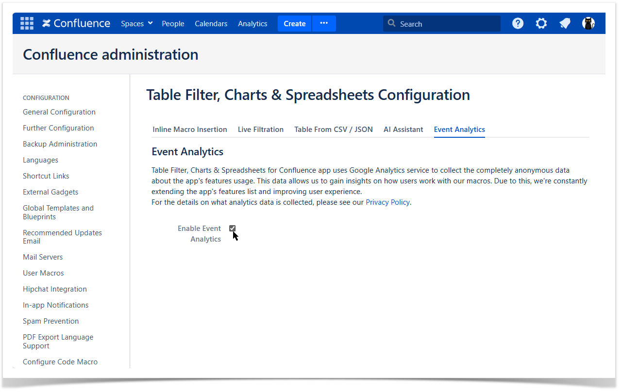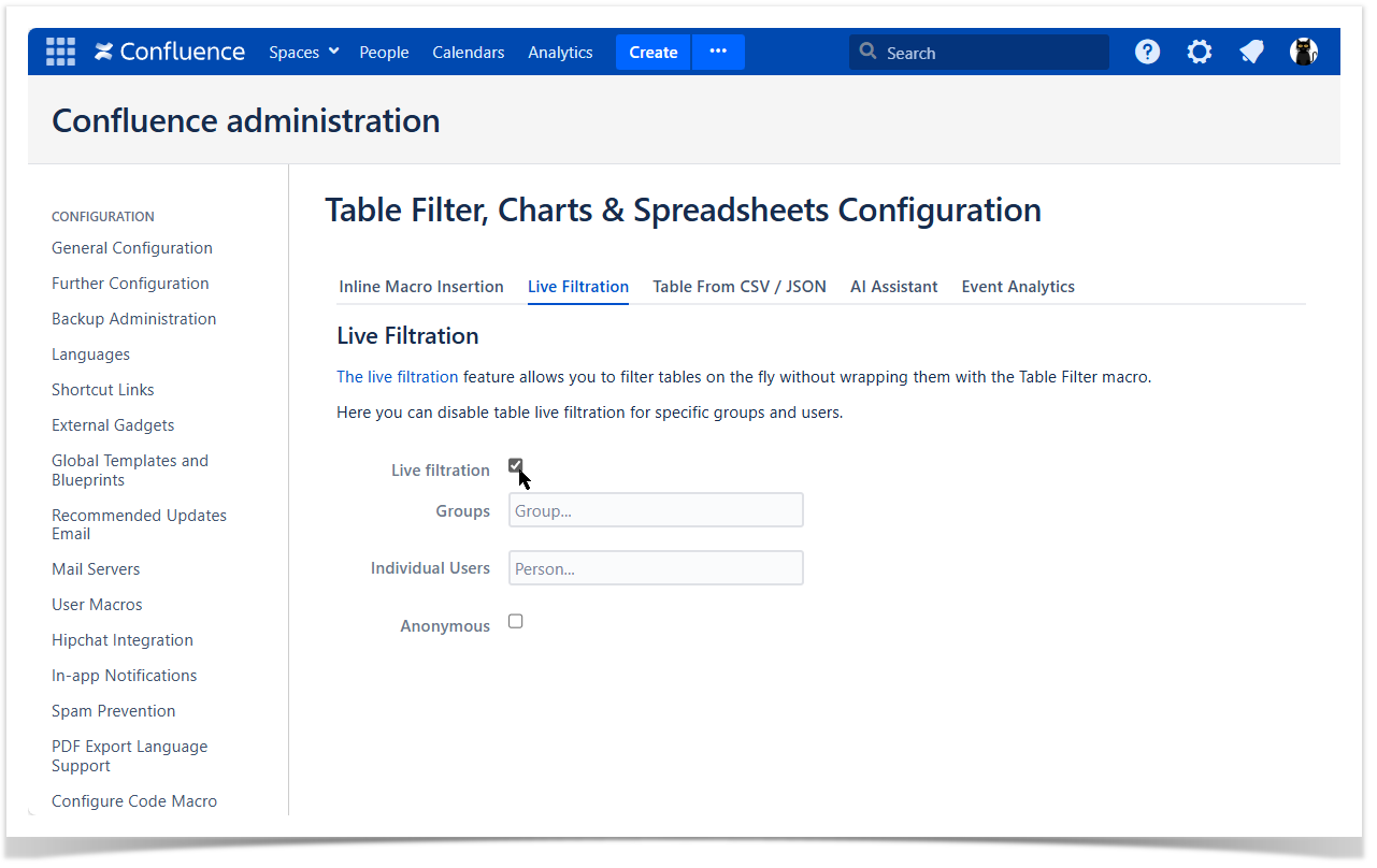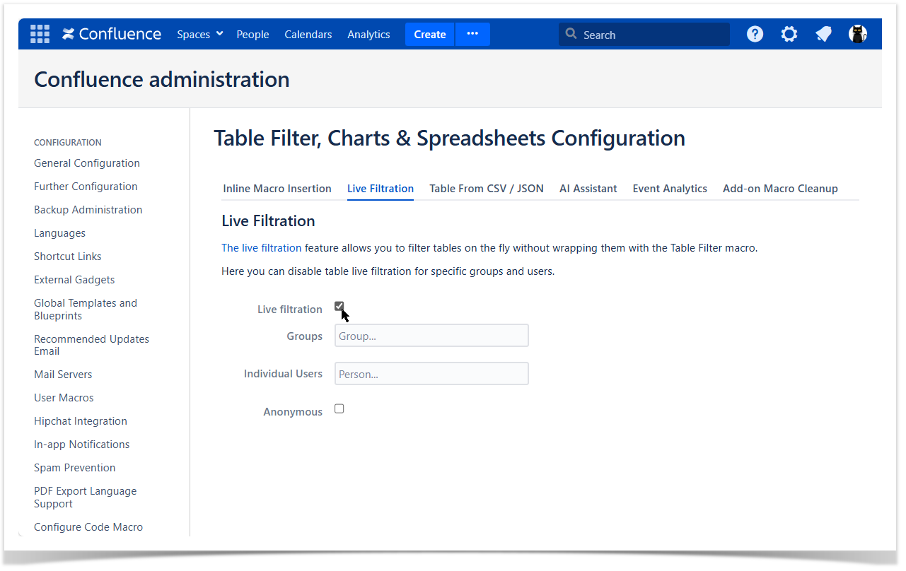 - On the sidebar, find the Table Filter, Charts & Spreadsheets menu section and select Configuration
