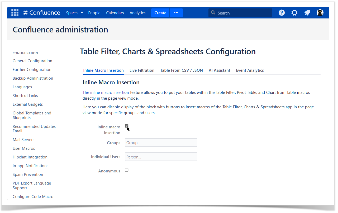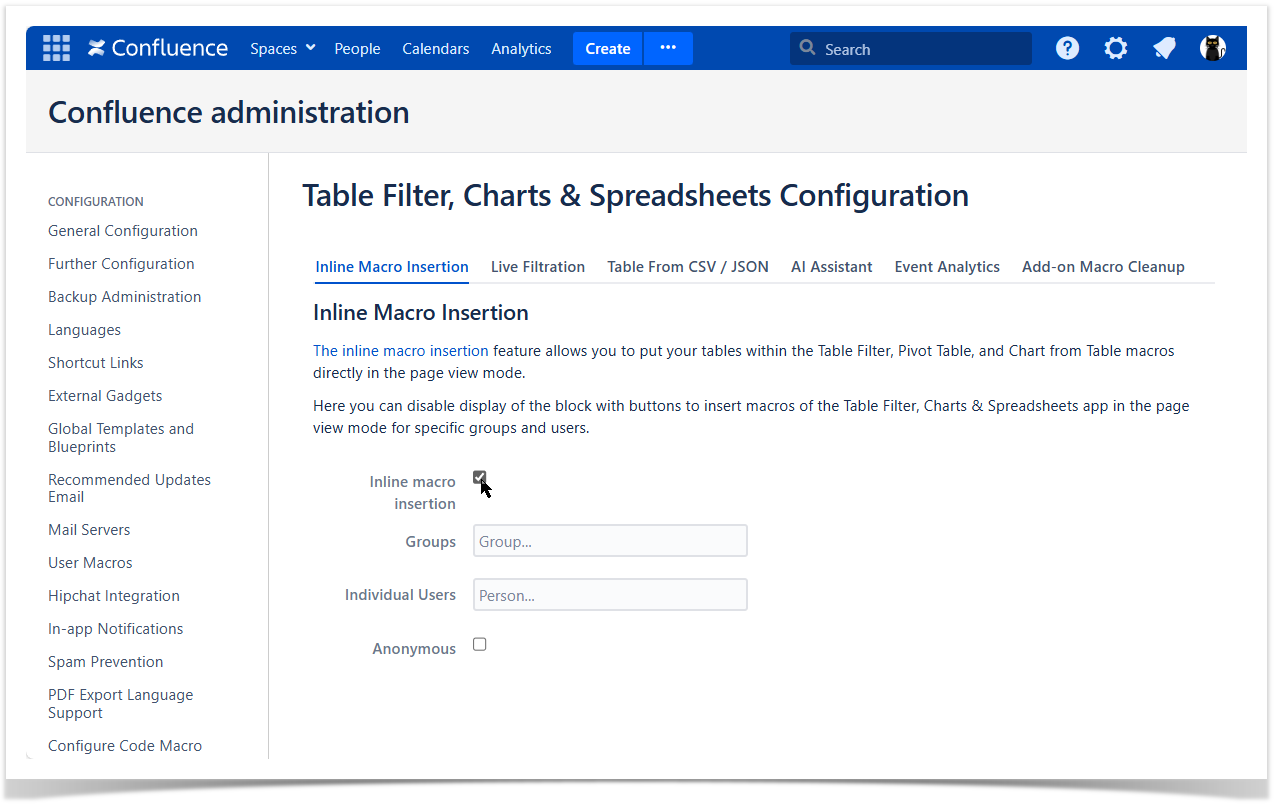 - Enable or disable the Inline Macro Insertion icons for all users or particular users and (or) groups